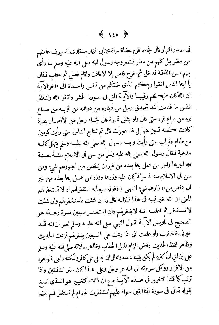 في صدر النهار قال فجاءه قوم حفاة عراة مجتابي النمار متقلدي السيوف عامتهم من مضر بل كلهم من مضر فتمعر وجه رسول الله صلى الله عليه و سلم لما رأى بهم من الفاقة فدخل ثم خرج فأمر بلالا فأذن وأقام فصلى ثم خطب فقال يا أيها الناس اتقوا ربكم الذي خلقكم من نفس واحدة إلى آخر الآية إن الله كان عليكم رقيبا والآية التي في سورة الحشر واتقوا الله ولتنظر نفس ما قدمت لغد تصدق رجل من ديناره من درهمه من ثوبه من صاع بره من صاع تمره حتى قال ولو بشق تمره قال فجاء رجل من الأنصار بصرة كادت كفه تعجز عنها بل قد عجزت قال ثم تتابع الناس حتى رأيت كومين من طعام وثياب حتى رأيت وجه رسول الله صلى الله عليه و سلم يتهلل كأنه مذهبة فقال رسول الله صلى الله عليه و سلم من سن في الإسلام سنة حسنة فله أجرها وأجر من عمل بها بعده من غير أن ينقص من أجورهم شيء ومن سن في الإسلام سنة سيئة كان عليه وزرها ووزر من عمل بها بعده من غير أن ينقص من أوزارهم شيء انتهى