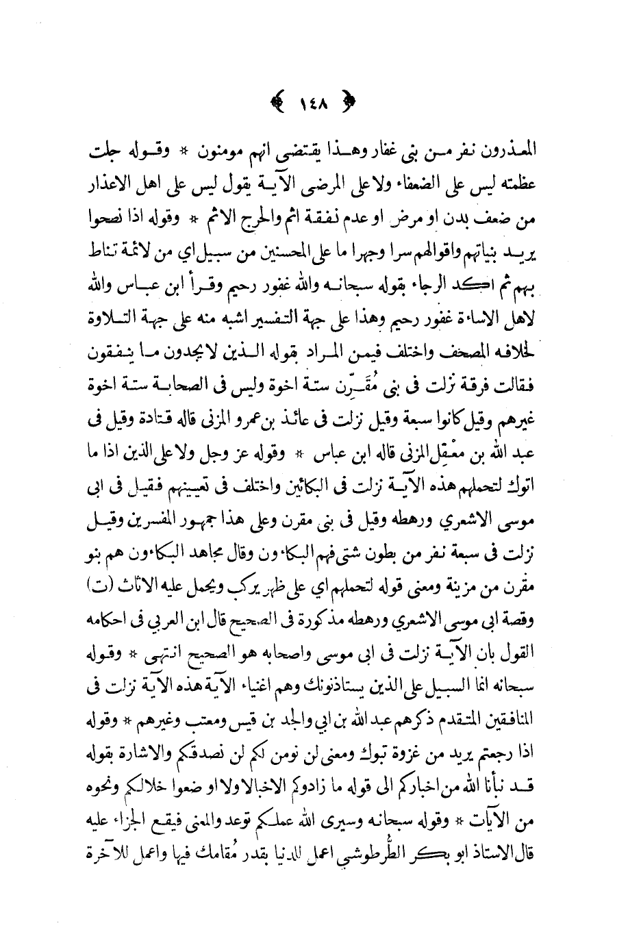 وقوله عز و جل ولا على الذين إذا ما أتوك لتحملهم هذه الآية نزلت في البكائين واختلف في تعيينهم فقيل في أبي موسى الأشعري ورهطه وقيل في بني مقرن وعلى هذا جمهور المفسرين وقيل نزلت في سبعة نفر من بطون شتى فهم البكاءون وقال مجاهد البكاءون هم بنو مقرن من مزينة ومعنى قوله لتحملهم أي على ظهر يركب ويحمل عليه الأثاث ت وقصة أبي موسى الأشعري ورهطه مذكورة في الصحيح قال ابن العربي في أحكامه القول بأن الآية نزلت في أبي موسى وأصحابه هو الصحيح انتهى