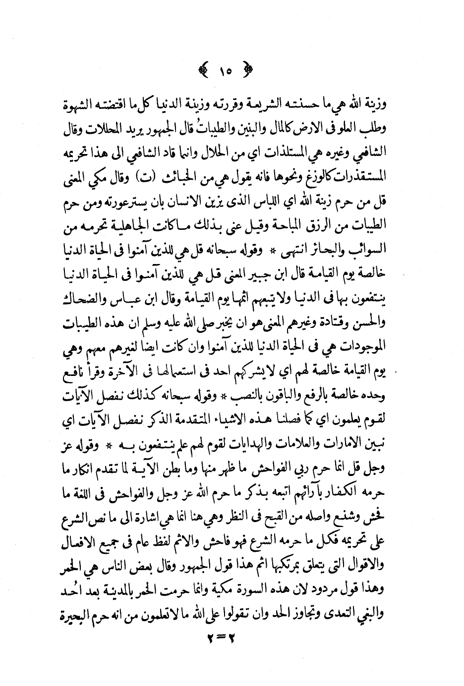 وزينة الله هي ما حسنته الشريعة وقررته وزينة الدنيا كل ما اقتضته الشهوة وطلب العلو في الأرض كالمال والبنين والطيبات قال الجمهور يريد المحللات وقال الشافعي وغيره هي المستلذات أي من الحلال وإنما قاد الشافعي إلى هذا تحريمه المستقذرات كالوزغ ونحوها فإنه يقول هي من الخبائث ت وقال مكي المعنى قل من حرم زينة الله أي اللباس الذي يزين الإنسان بأن يستر عورته ومن حرم الطيبات من الرزق المباحة وقيل عنى بذلك ما كانت الجاهلية تحرمه من السوائب والبحائر انتهى