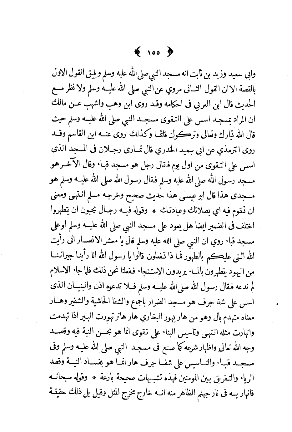 وقوله فيه رجال يحبون أن يتطهروا اختلف في الضمير أيضا هل يعود على مسجد النبي صلى الله عليه و سلم أو على مسجد قباء روي أن النبي صلى الله عليه و سلم قال يا معشر الأنصار أني رأيت الله أثنى عليكم بالطهور فما ذا تفعلون قالوا يا رسول الله انا رأينا جيراننا من اليهود يتطهرون بالماء يريدون الاستنجاء ففعلنا نحن ذلك فلما جاء الإسلام لم ندعه فقال رسول الله صلى الله عليه و سلم فلا تدعوه إذن والبنيان الذي أسس على شفا جرف هو مسجد الضرار بإجماع والشفا الحاشية والشفير وهار معناه متهدم بال وهو من هار يهور البخاري هار هائر تهورت البير إذا تهدمت وانهارت مثله انتهى وتأسيس البناء على تقوى إنما هو بحسن النية فيه وقصد وجه الله تعالى وإظهار شرعه كما صنع في مسجد النبي صلى الله عليه و سلم وفي مسجد قباء والتأسيس على شفا جرف هار إنما هو بفساد النية وقصد الرياء والتفريق بين المؤمنين فهذه تشبيهات صحيحة بارعة