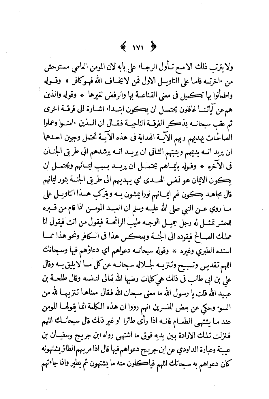 وقوله بإيماهم يحتمل أن يريد بسبب إيمانهم ويحتمل أن يكون الإيمان هو نفس الهدى أي يهديهم إلى طريق الجنة بنور إيمانهم قال مجاهد يكون لهم إيمانهم نورا يمشون به ويتركب هذا التأويل على ما روي عن النبي صلى الله عليه و سلم أن العبد المؤمن إذا قام من قبره للحشر تمثل له رجل جميل الوجه طيب الرائحة فيقول من أنت فيقول أنا عملك الصالح فيقوده إلى الجنة وبعكس هذا في الكافر ونحو هذا ما أسنده الطبري وغيره