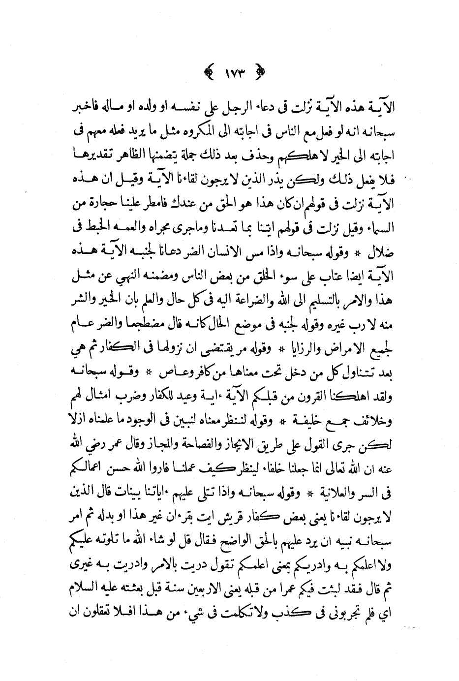 وقوله سبحانه وإذا تتلى عليهم ءاياتنا بينات قال الذين لا يرجون لقاءنا يعني بعض كفار قريش ايت بقرآن غير هذا أو بدله ثم أمر سبحانه نبيه أن يرد عليهم بالحق الواضح فقال قل لو شاء الله ما تلوته عليكم ولا أعلمكم به وأدريكم بمعنى أعلمكم تقول دريت بالأمر وأدريت به غيري ثم قال فقد لبثت فيكم عمرا من قبله يعني الأربعين سنة تبل بعثه عليه السلام أي فلم تجربوني في كذب ولا تكلمت في شيء من هذا أفلا تعقلون أن