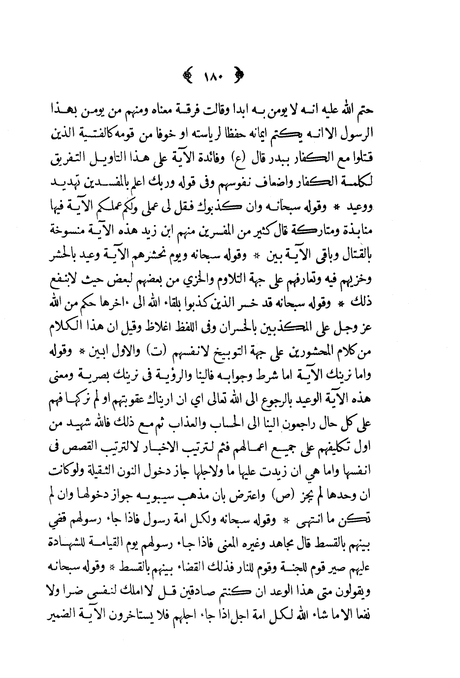 حتم الله عليه أنه لا يؤمن به أبدا وقالت فرقة معناه ومنهم من يؤمن بهذا الرسول إلا أنه يكتم إيمانه حفظا لرياسته أو خوفا من قومه كالفتية الذين قتلوا مع الكفار ببدر قال ع وفائدة الآية على هذا التأويل التفريق لكلمة الكفار وإضعاف نفوسهم وفي قوله وربك أعلم بالمفسدين تهديد ووعيد