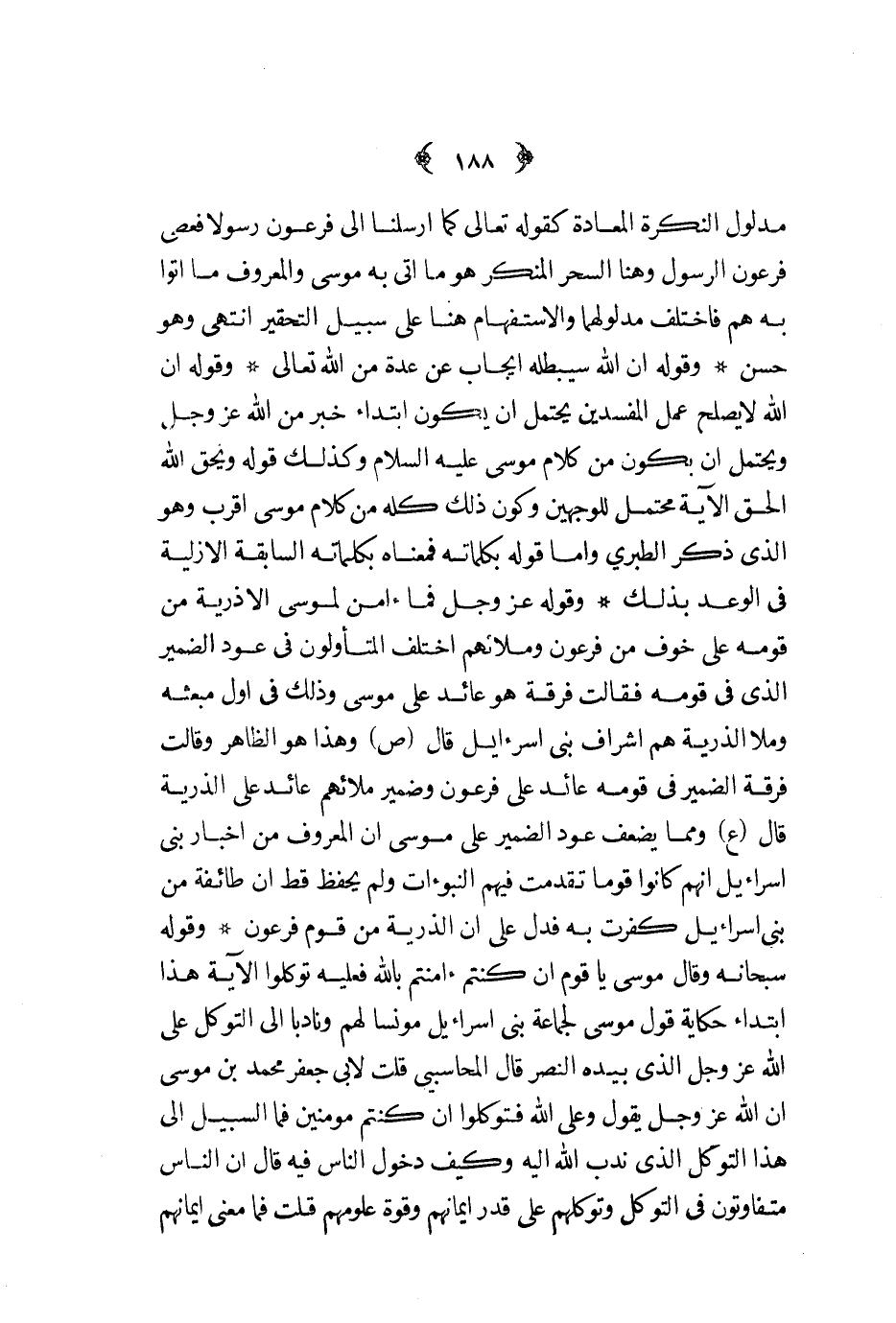 وقوله سبحانه وقال موسى يا قوم إن كنتم ءامنتم بالله فعليه توكلوا الآية هذا ابتداء حكاية قول موسى لجماعة بني إسرائيل مونسا لهم ونادبا إلى التوكل على الله عز و جل الذي بيده النصر قال المحاسبي قلت لأبي جعفر محمد بن موسى أن الله عز و جل يقول وعلى الله فتوكلوا إن كنتم مؤمنين فما السبيل إلى هذا التوكل الذي ندب الله إليه وكيف دخول الناس فيه قال إن الناس متفاوتون في التوكل وتوكلهم على قدر إيمانهم وقوة علومهم قلت فما معنى إيمانهم