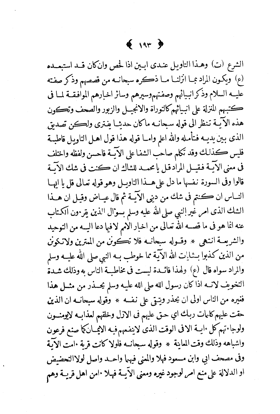 الشرع ت وهذا التأويل عندي أبين إذا لخص وإن كان قد استبعده ع ويكون المراد بما أنزلنا ما ذكره سبحانه من قصصهم وذكر صفته عليه السلام وذكر أنبيائهم وصفتهم وسيرهم وسائر أخبارهم الموافقة لما في كتبهم المنزلة على أنبيائهم كالتوراة والإنجيل والزبور والصحف وتكون هذه الآية تنظر إلى قوله سبحانه ما كان حديثا يفترى ولكن تصديق الذي بين يديه فتأمله والله أعلم وأما قوله هذا قول أهل التأويل قاطبة فليس كذلك وقد تكلم صاحب الشفا على الآية فأحسن ولفظه واختلف في معنى الآية فقيل المراد قل يا محمد للشاك إن كنت في شك الآية قالوا وفي السورة نفسها ما دل على هذا التأويل وهو قوله تعالى قل يا أيها الناس إن كنتم في شك من ديني الآية ثم قال عياض وقيل أن هذا الشك الذي أمر غير النبي صلى الله عليه و سلم بسؤال الذين يقرءون الكتاب عنه إنما هو في ما قصه الله تعالى من أخبار الأمم لا فيما دعا إليه من التوحيد والشريعة انتهى