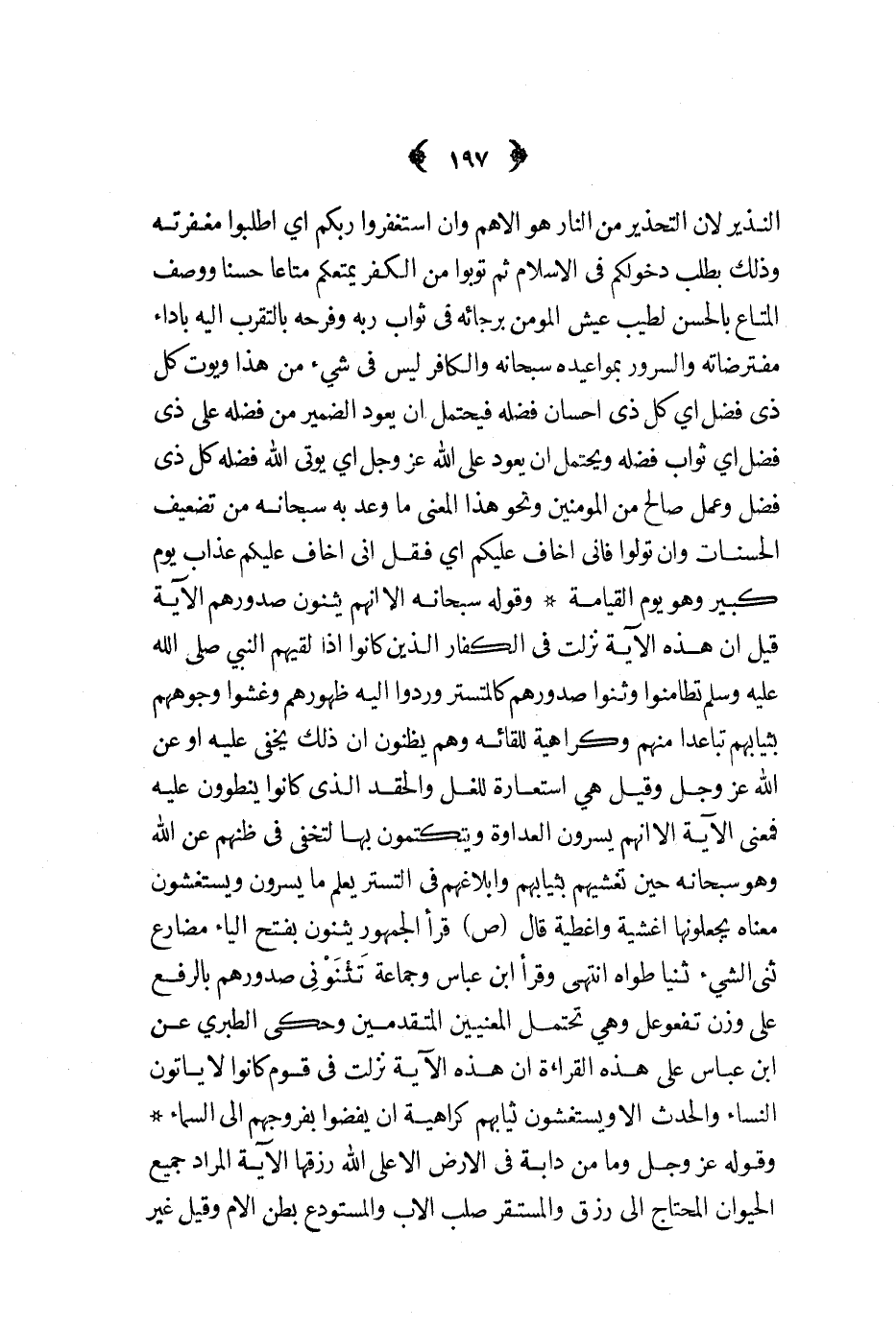 وقوله سبحانه الا أنهم يثنون صدورهم الآية قيل إن هذه الآية نزلت في الكفار الذين كانوا إذا لقيهم النبي صلى الله عليه و سلم تطامنوا وثنوا صدورهم كالمتستر وردوا إليه ظهورهم وغشوا وجوههم بثيابهم تباعدا منهم وكراهية للقائه وهم يظنون أن ذلك يخفى عليه أو عن الله عز و جل وقيل هي استعارة للغل والحقد الذي كانوا ينطوون عليه فمعنى الآية ألا انهم يسرون العداوة ويتكتمون بها لتخفى في ظنهم عن الله وهو سبحانه حين تغشيهم بثيابهم وإبلاغهم في التستر يعلم ما يسرون ويستغشون معناه يجعلونها أغشية وأغطية قال ص قرأ الجمهور يثنون بفتح الياء مضارع ثنى الشيء ثنيا طواه انتهى وقرأ ابن عباس وجماعة تثنونى صدورهم بالرفع على وزن تفعوعل وهي تحتمل المعنيين المتقدمين وحكى الطبري عن ابن عباس على هذه القراءة أن هذه الآية نزلت في قوم كانوا لا يأتون النساء والحدث ألا ويستغشون ثيابهم كراهية أن يفضوا بفروجهم إلى السماء