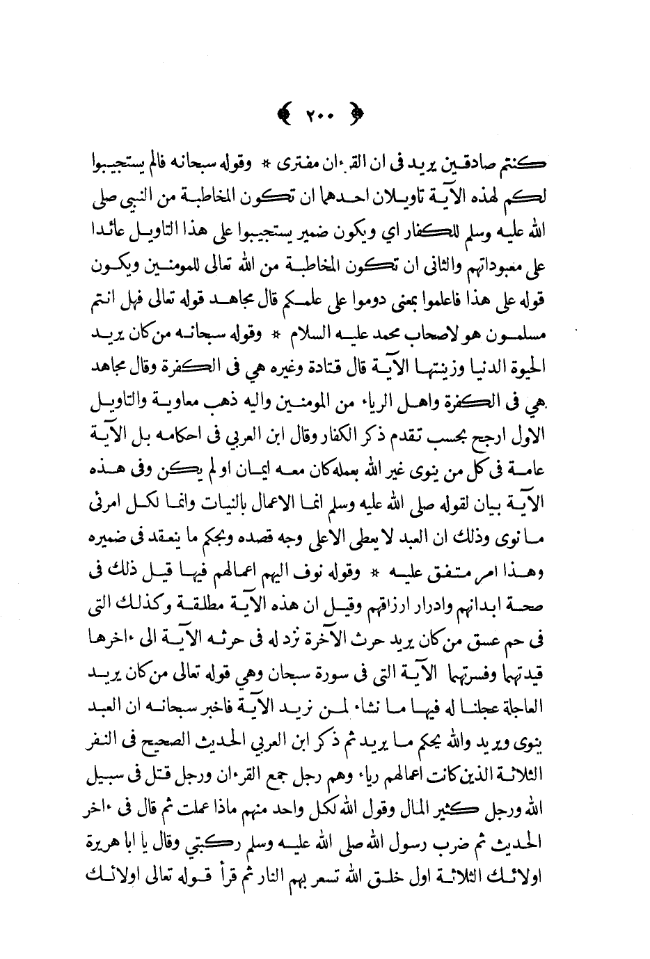 وقوله نوف إليهم أعمالهم فيها قيل ذلك في صحة أبدانهم وإدرار أرزاقهم وقيل إن هذه الآية مطلقة وكذلك التي في حم عسق من كان يريد حرث الآخرة نزد له في حرثه الآية إلى آخرها قيدتهما وفسرتهما الآية التي في سورة سبحانه وهي قوله تعالى من كان يريد العاجلة عجلنا له فيها ما نشاء لمن نريد الآية فأخبر سبحانه أن العبد ينوي ويريد والله يحكم ما يريد ثم ذكر ابن العربي الحديث الصحيح في النفر الثلاثة الذين كانت أعمالهم رياء وهم رجل جمع القرآن ورجل قتل في سبيل الله ورجل كثير المال وقول الله لكل واحد منهم ماذا عملت ثم قال في آخر الحديث ثم ضرب رسول الله صلى الله عليه و سلم ركبتي وقال يا أبا هريرة أولئك الثلاثة أول خلق الله تسعر بهم النار ثم قرأ قوله تعالى اولائك