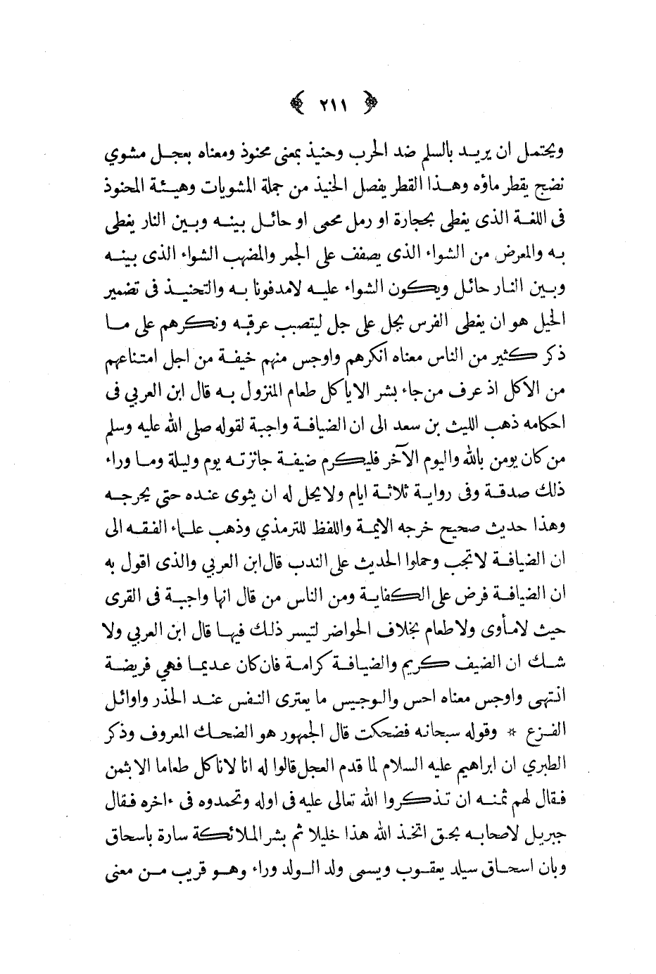 ويحتمل أن يريد بالسلم ضد الحرب وحنيذ بمعنى محنوذ ومعناه بعجل مشوي نضج يقطر ماؤه وهذا القطر يفصل الحنيذ من جملة المشويات وهيئة المحنوذ في اللغة الذي يغطى بحجارة أو رمل محمى أو حائل بينه وبين النار يغطى به والمعرض من الشواء الذي يصفف على الجمر والمضهب الشواء الذي بينه وبين النار حائل ويكون الشواء عليه لا مدفونا به والتحنيذ في تضمير الخيل هو أن يغطى الفرس بجل على جل ليتصبب عرقه ونكرهم على ما ذكر كثير من الناس معناه أنكرهم وأوجس منهم خيفة من أجل امتناعهم من الأكل إذ عرف من جاء بشر إلا يأكل طعام المنزول به قال ابن العربي في أحكامه ذهب الليث بن سعد إلى أن الضيافة واجبة لقوله صلى الله عليه و سلم من كان يؤمن بالله واليوم الآخر فيكرم ضيفه جائزته يوم وليلة وما وراء ذلك صدقة وفي رواية ثلاثة أيام ولا يحل له أن يثوى عنده حتى يحرجه وهذا حديث صحيح خرجه الأيمة واللفظ للترمذي وذهب علماء الفقه إلى أن الضيافة لا تجب وحملوا الحديث على الندب قال ابن العربي والذي أقول به أن الضيافة فرض على الكفاية ومن الناس من قال أنها واجبة في القرى حيث لا مأوى ولا طعام بخلاف الحواضر لتيسر ذلك فيها قال ابن العربي ولا شك أن الضيف كريم والضيافة كرامة فإن كان عديما فهي فريضة انتهى وأوجس معناه أحس والوجيس ما يعترى النفس عند الحذر وأوائل الفزع