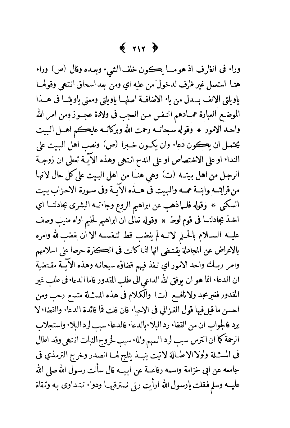 وقوله سبحانه رحمت الله وبركاته عليكم أهل البيت يحتمل أن يكون دعاء وأن يكون خبرا ص ونصب أهل البيت على النداء أو على الاختصاص أو على المدح انتهى وهذه الآية تعطى أن زوجة الرجل من أهل بيته ت وهي هنا من أهل البيت على كل حال لأنها من قرابته وابنة عمه والبيت في هذه الآية وفي سورة الأحزاب بيت السكنى
