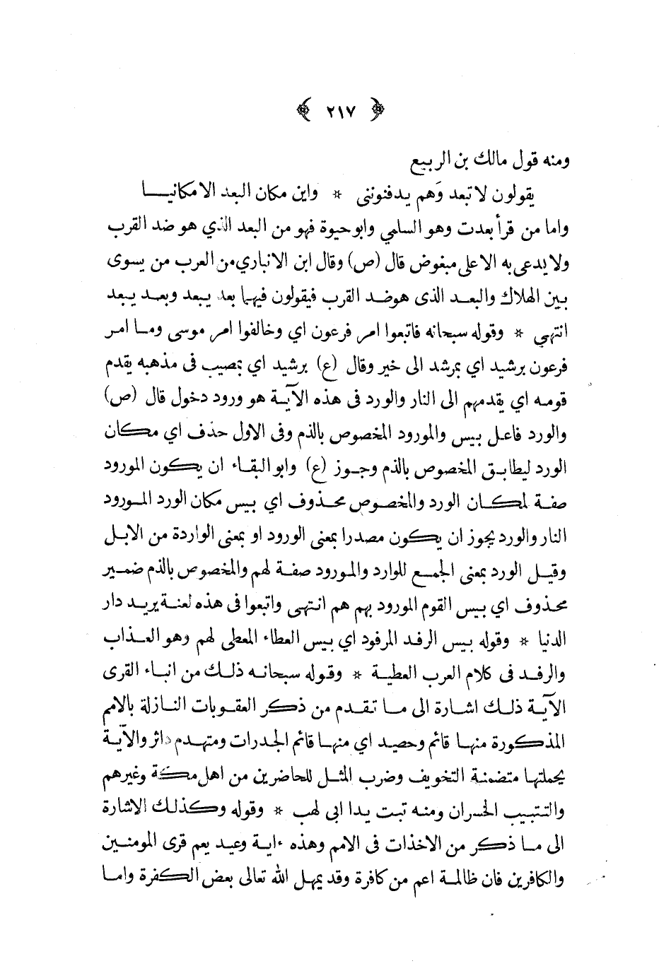ومنه قول مالك بن الربيع ... يقولن لا تبعد وهم يدفنونني ... وأين مكان البعد إلا مكانيا ...