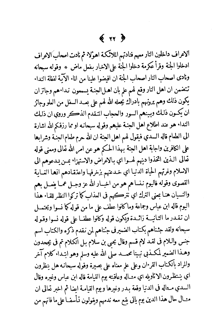 قوله سبحانه ونادى أصحاب النار أصحاب الجنة أن أفيضوا علينا من الماء الآية لفظة النداء تتضمن أن أهل النار وقع لهم علم بأن أهل الجنة يسمعون نداءهم وجائز أن يكون ذلك وهم يرونهم بادراك يجعله الله لهم على بعد السفل من العلو وجائز أن يكون ذلك وبينهم السور والحجاب المتقدم الذكر وروي أن ذلك النداء هو عند اطلاع أهل الجنة عليهم وقوله سبحانه أو مما رزقكم الله إشارة إلى الطعام قاله السدي فيقول لهم أهل الجنة إن الله حرم طعام الجنة وشرابها على الكافرين وإجابة أهل الجنة بهذا الحكم هو عن أمر الله تعالى ومعنى قوله تعالى الذين اتخذوا دينهم لهوا أي بالإعراض والاستهزاء بمن يدعوهم إلى الإسلام وغرتهم الحياة الدنيا أي خدعتهم بزخرفها واعتقادهم أنها الغاية القصوى وقوله فاليوم ننساهم هو من أخبار الله عز و جل عما يفعل بهم والنسيان هنا بمعنى الترك أي نتركهم في العذاب كما تركوا النظر للقاء هذا اليوم قاله ابن عباس وجماعة وما كانوا عطف على ما من قوله كما نسوا ويحتمل أن تقدر ما الثانية زائدة ويكون قوله وكانوا عطفا على قوله نسوا وقوله سبحانه ولقد جئناهم بكتاب الضمير في جئناهم لمن نقدم ذكره والكتاب اسم جنس واللام في لقد لام قسم وقال يحيى بن سلام بل الكلام تم في يجحدون وهذا الضمير لمكذبي نبيا محمد صلى الله عليه و سلم وهو ابتداء كلام آخر والمراد بالكتاب القرآن الكريم وعلى علم معناه على بصيرة وقوله سبحانه هل ينظرون أي ينتظرون إلا تأويله أي مئاله وعاقبته يوم القيامة قاله ابن عباس وغيره وقال السدي مئالة في الدنيا وقعة بدر وغيرها ويوم القيامة أيضا ثم أخبر تعالى أن مئال حال هذا الدين يوم يأتي يقع معه ندمهم ويقولون تأسفا على ما فاتهم من