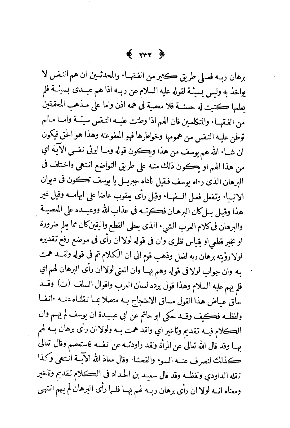 برهان ربه فعلى طريق كثير من الفقهاء والمحدثين أن هم النفس لا يؤاخذ به وليس بسيئة لقوله عليه السلام عن ربه إذا هم عبدي بسيئة فلم يعلمها كتبت له حسنة فلا معصية في همه إذن وأما على مذهب المحققين من الفقهاء والمتكلمين فإن الهم إذا وظنت عليه النفس سيئة وأما ما لم توطن عليه النفس من همومها وخواطرها فهو المعفو عنه وهذا هو الحق فيكون إن شاء الله هم يوسف من هذا ويكون قوله وما ابرئى نفسي الآية أي من هذا الهم أو يكون ذلك منه على طريق التواضع انتهى واختلف في البرهان الذي رآه يوسف فقيل ناداه جبريل يا يوسف لا تكون في ديوان الأنبياء وتفعل فعل السفهاء وقيل رأى يعقوب عاضا على ابهامه وقيل غيره هذا وقيل بل كان البرهان فكرته في عذاب الله ووعيده على المعصية والبرهان في كلام العرب الشيء الذي يعطى القطع واليقين كان مما يعلم ضرورة أو بخبر قطعي أو بقياس نظري وأن في قوله لولا أن رأى في موضع رفع تقديره لولا رؤيته برهان ربه لفعل وذهب قوم إلى أن الكلام تم في قوله ولقد همت به وأن جواب لولا في قوله وهم بها وان المعنى لولا أن رأى البرهان لهم أي فلم يهم عليه السلام وهذا قول يرده لسان العرب وأقوال السلف ت وقد ساق عياض هذا القول مساق احتجاج به متصلا بما نقلناه عنه آنفا ولفظه فكيف وقد حكى أبو حاتم عن أبي عبيدة أن يوسف إليهم وأن الكلام فيه تقديم وتأخير أي ولقد همت به ولولا أن رأى برهان به لهم بها وقد قال الله تعالى عن المرأة ولقد راودته عن نفسه فاستعصم وقال تعالى كذلك لنصرف عنه السوء والفحشاء وقال معاذ الله الآية انتهى وكذا نقله الداودي ولفظه وقد قال سعيد بن الحداد في الكلام تقديم وتأخير ومعناه أنه لولا أن رأى برهان ربه لهم بها فلما رأى البرهان لم يهم انتهى