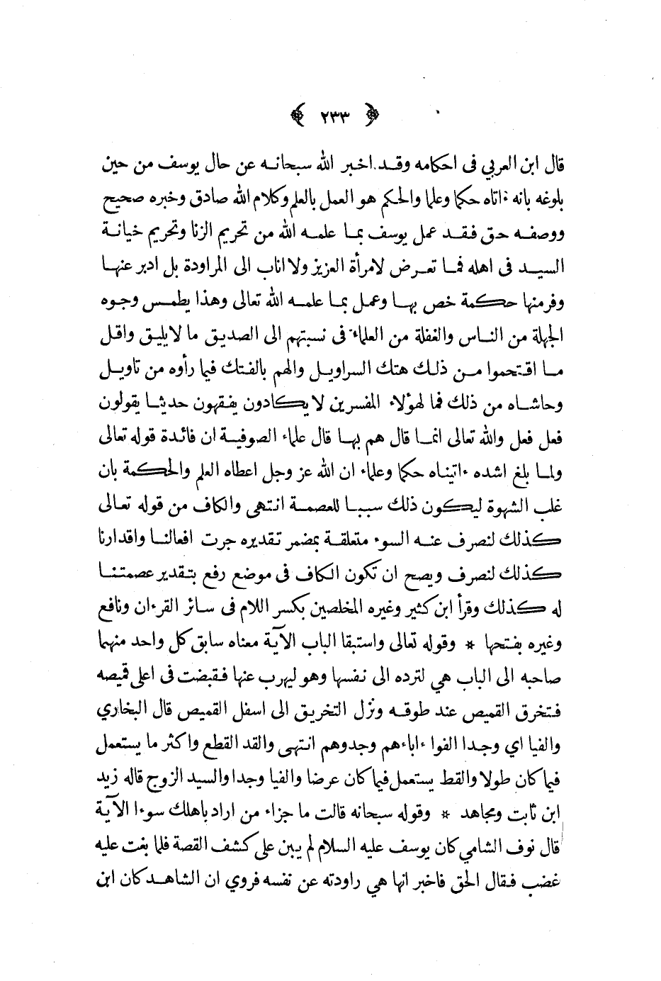 قال ابن العربي في أحكامه وقد أخبر الله سبحانه عن حال يوسف من حين بلوغه بأنه آتاه حكما وعلما والحكم هو العمل بالعلم وكلام الله صادق وخبره صحيح ووصفه حق فقد عمل يوسف بما علمه الله من تحريم الزنا وتحريم خيانة السيد في أهله فما تعرض لامرأة العزيز ولا أناب إلى المراودة بل أدبر عنها وفر منها حكمة خص بها وعمل بما علمه الله تعالى وهذا يطمس وجوه الجهلة من الناس والغفلة من العلماء في نسبتهم إلى الصديق ما لا يليق وأقل ما اقتحموا من ذلك هتك السراويل والهم بالفتك فيما رأوه من تأويل وحاشاه من ذلك فما لهؤلاء المفسرين لا يكادون يفقهون حديثا يقولون فعل فعل والله تعالى إنما قال هم بها قال علماء الصوفية إن فائدة قوله تعالى ولما بلغ أشده آتيناه حكما وعلما إن الله عز و جل أعطاه العلم والحكمة بأن غلب الشهوة ليكون ذلك سببا للعصمة انتهى والكاف من قوله تعالى كذلك لنصرف عنه السوء متعلقة بمضمر تقديره جرت أفعالنا واقدارنا كذلك لنصرف ويصح أن تكون الكاف في موضع رفع بتقدير عصمتنا له كذلك وقرأ ابن كثير وغيره المخلصين بكسر اللام في سائر القرآن ونافع وغيره بفتحها