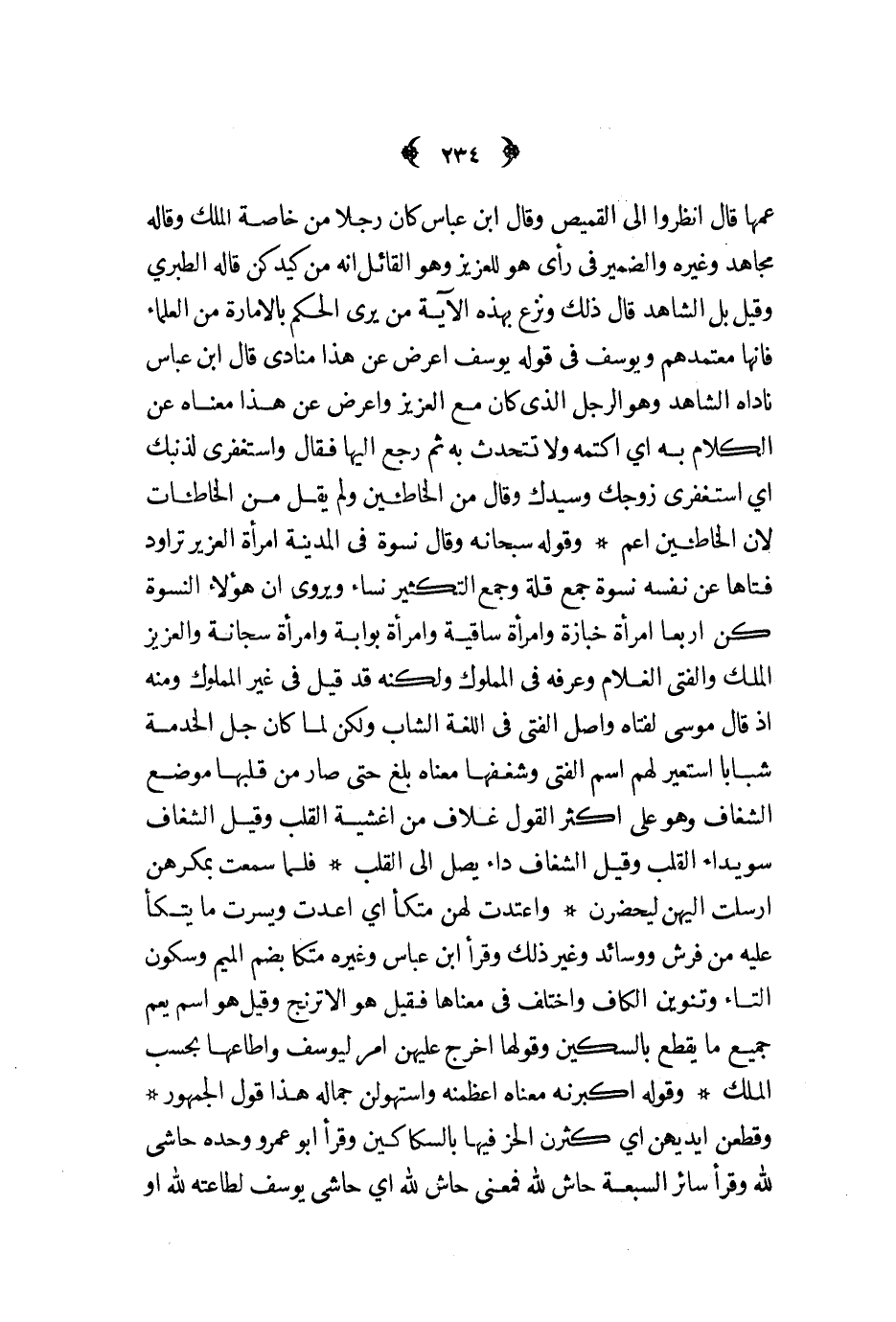 وقوله سبحانه وقال نسوة في المدينة أمرأة العزيز تراود فتاها عن نفسه نسوة جمع قلة وجمع التكثير نساء ويروى أن هؤلاء النسوة كن أربعا امرأة خبازة وامرأة بوابة وامرأة سجانة والعزيز الملك والفتى الغلام وعرفه في المملوك ولكنه قد قيل في غير المملوك ومنه إذ قال موسى لفتاه واصل الفتى في اللغة الشاب ولكن لماكان جل الخدمة شبابا استعير لهم اسم الفتى وشغفها معناه بلغ حتى صار من قلبها موض الشغاف وهو على اكثر القول غلاف من أغشية القلب وقيل الشغاف سويداء القلب وقيل الشغاف داء يصل إلى القلب