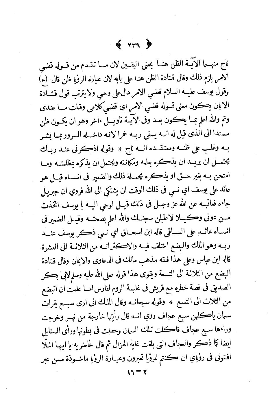 ناج منهما الآية الظن هنا بمعنى اليقين لأن ما تقدم من قوله قضى الأمر يلزم ذلك وقال قتادة الظن هنا على بابه لأن عبارة الرؤيا ظن قال ع وقول يوسف عليه السلام قضي الأمر دال على وحي ولا يترتب قول قتادة إلا بإن يكون بعد وفي الآية تأويل آخر وهو أن يكون ن مسندا إلى الذي قيل له أه يسقى ربه خمرا لأنه داخله السرور بما بشر به وغلب على ظنه ومعتقده أنه ناج وقوله أذكرني عند ربك يحتمل أن يريد أن يذكره بعلمه ومكانته ويحتمل أن يذكره بمظلمته وما امتحن به بغير حق أو يذكره يحمله ذلك والضمير في انساه قيل هو عائد على يوسف أي نسي في ذلك الوقت أن يشتكي إلى الله فروي أن جبريل جاءه فعاتبه عن الله عز و جل في ذلك قيل أوحي إليه يا يوسف أتخذت من دوني وكيلا لا طيلن سبحانك والله أعلم بصحته وقيل الضمير في انساه عائد على الساقي قاله ابن إسحاق أي نسي ذكر يوسف عند ربه وهو الملك والبضع اختلف فيه والأكثر أنه من الثلاثة إلى العشرة قاله ابن عباس وعلى هذا فقه مذهب مالك في الدعاوي والإيمان وقال قتادة البضع من الثلاثة إلى التسعة ويقوى هذا قوله صلى الله عليه و سلم لأبي بكر الصديق في يقصة خطره مع قريش في غلبة الروم لفارس أما علمت أن البضع من الثلاث إلى التسع وقوله سبحانه وقال الملك إني أرى سبع بقرات سمان يأكلهن سبع عجاف روي أنه قال رأيتها خارجة من نهر وخرجت وراءها سبع عجاف فأكلت تلك السمان وحصلت في بطونها ورأى السنابل أيضا كما ذكر والعجاف التي بلغت غاية الهزال ثم قال لحاضريه يا أيها الملأ افتوني في رؤياي إن كنتم للرؤيا تعبرون وعبارة الرؤيا مأخذوة من عبر