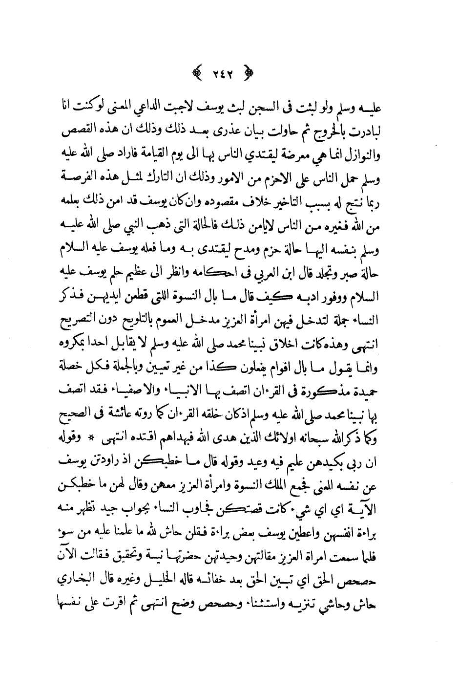 عليه وسلم ولو لبثت في السجن لبث يوسف لاجبت الداعي المعنى لو كنت أنا لبادرت بالخروج ثم حاولت بيان عذري بعد ذلك وذلك أن هذه القصص والنوازل إنما هي معرضة ليقتدي الناس بها إلى يوم القيامة فأراد صلى الله عليه و سلم حمل الناس على الاحزم من الأمور وذلك أن التارك لمثل هذه الفرصة ربما نتج له بسبب التأخير خلاف مقصوده وإن كان يوسف قد آمن ذلك بعلمه من الله فغيره من الناس لا يأمن ذلك فالحالة التي ذهب النبي صلى الله عليه و سلم بنفسه إليها حالة حزم ومدح ليقتدى به وما فعله يوسف عليه السلام حالة صبر وتجلد قال ابن العربي في أحكامه وأنظر إلى عظيم حلم يوسف عليه السلام ووفرو أدبه كيف قال ما بال النسوة اللتي قطعن أيديهن فذكر النساء جملة لتدخل فيهن امرأة العزيز مدخل العموم بالتلويح دون التصريح انتهى وهذه كانت أخلاق نبينا محمد صلى الله عليه و سلم لا يقابل أحد بمكروه وإنما يقول ما بال أقوام يفعلون كذا من غير تعيين وبالجملة فكل خصلة حميدة مذكورة في القرآن أتصف بها الأنبياء والأصفياء فقد أتصف بها نبينا محمد صلى الله عليه و سلم إذ كان خلقه القرآن كما روته عائشة في الصحيح وكما ذكر الله سبحانه اولائك الذين هدى الله فبهداهم اقتده انتهى وقوله إن ربي بكيدهن عليم فيه وعيد وقوله قال ما خطبكن إذ راودتن يوسف عن نفسه المعنى فجمع الملك النسوة وامرأة العزيز معهن وقال لهن ما خطبكن الآين أي أي شيء كانت قصتكن فجاوب النساء بجواب جيد تظهر منه براءة أنفسهن واعطين يوسف بعض براءة فقلن حاش لله ما علمنا عليه من سوء فلماس معت امرأة العزيز مقالتهن وحيدتهن حضرتها نية وتحقيق فقالت الآن حصحص الحق أي تبين الحق بعد خفائه قاله الخليل وغيره قال البخاري حاش وحاشى تنزيه واستثناء وحصحص وضح انتهى ثم أقرت على نفسها