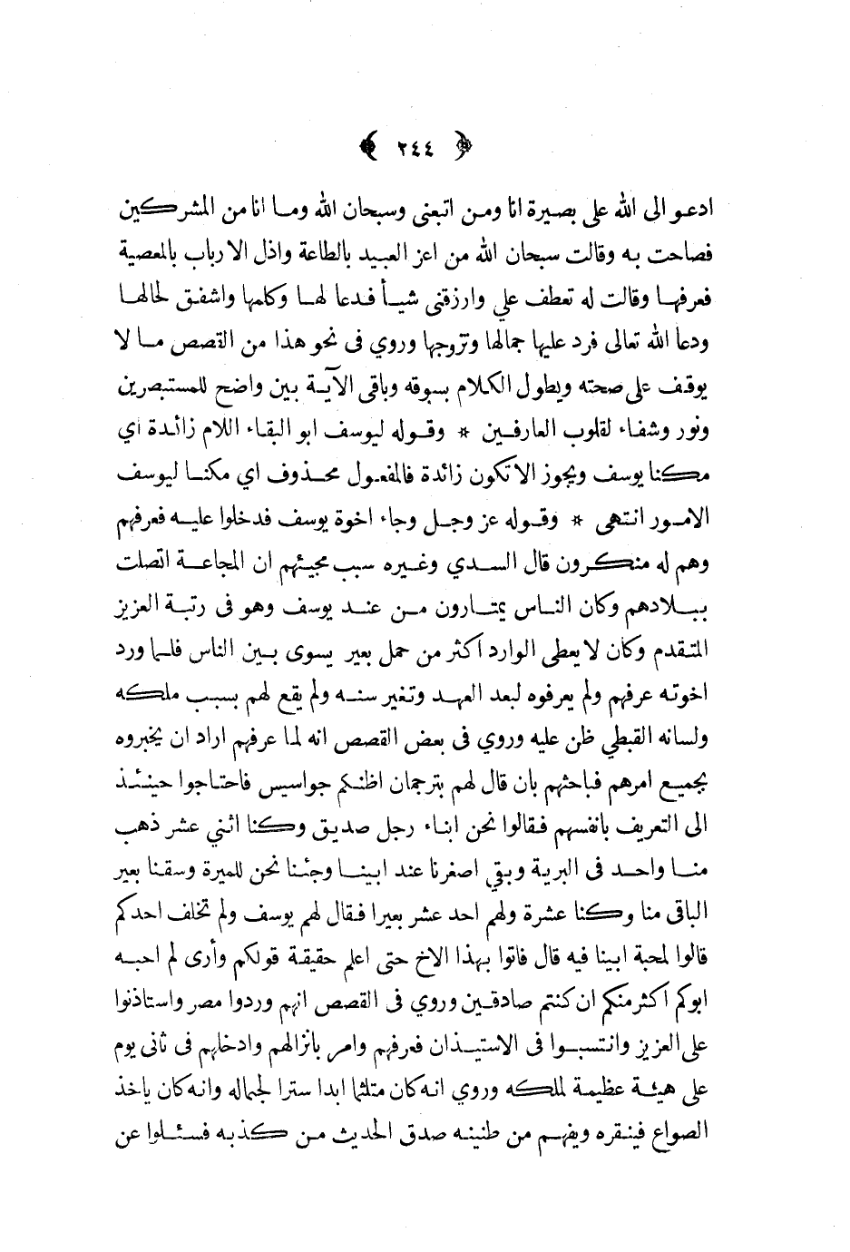 ادعوا إلى الله على بصيرة انا ومن ابعني وسبحان الله وما انا من المشركين فصاحب به وقالت سبحان الله من أعز العبيد بالطاعة وأذل الأرباب بالمعصية فعرفها وقالت له تعطف علي وارزقني شيئا فدعا له وكلمها واشفق لحالها ودعا الله تعالى فرد عليها جمالها وتزوجها وروي في نحو هذا من القصص ما لا يوقف على صحته ويطول الكلام بسبوقه وباقي الآية بين واضح للمستبصرين ونور وشفاء لقلوب العارفين وقوله ليوسف ابو البقاء اللام زائدة أي مكنا يوسف ويجوز ألا تكون زائدة فالمفعول محذوف أي مكنا ليوسف الأمور انتهى وقوله عز و جل وجاء أخوة يوسف فدخلوا عليه فعرفهم وهم له منكرون قال السدي وغيره سبب مجيئهم أن المجاعة اتصلت ببلادهم وكان الناس يمتارون من عند يوسف وهو في رتبة العزيز المتقدم وكان لا يعطى الوارد أكثر من حمل بعير يسوي بين الناس فلما ورد أخوته عرفهم ولم يعرفوه لبعد العهد وتغير سنه ولم يقع لهم بسبب ملكه ولسانه القبطي ظن عليه وروي في بعض القصص أنه لما عرفهم أراد أن يخبروه بجيمع أمرهم فباحثهم بأن قال لهم بترجمان اظنكم جواسيس فاحتاجوا حينئذ إلى التعريف بأنفسهم فقالوا نحن أبناء رجل صديق وكنا اثني عشر ذهب منا واحد في البرية وبقي أصغرنا عند أبينا وجئنا نحن للميرة وسقنا بعير الباقي منا وكنا عشرة ولهم أحد عشر بعير فقال لهم يوسف ولم تخلف أحدكم قالوا لمحبة أبينا فيه قال فأتوا بهذا الأخ حتى أعلم حقيقة قولكم وأرى لم أحبه أبوكم أكثر منكم إن كنتم صادقين وروي في القصص أنهم وردوا مصر واستأذنوا على العزيز وانتسبوا في الاستيذان فعرفهم وأمر بإنزالهم وأدخالهم في ثاني يوم على هيئة عظيمة لملكه وروي أنه كان متلثما ابدا سترا لجماله وأنه كان يأخذ الصلواع فينقره ويفهم من طنينه صدق الحديث من كذبه فسئلوا عن