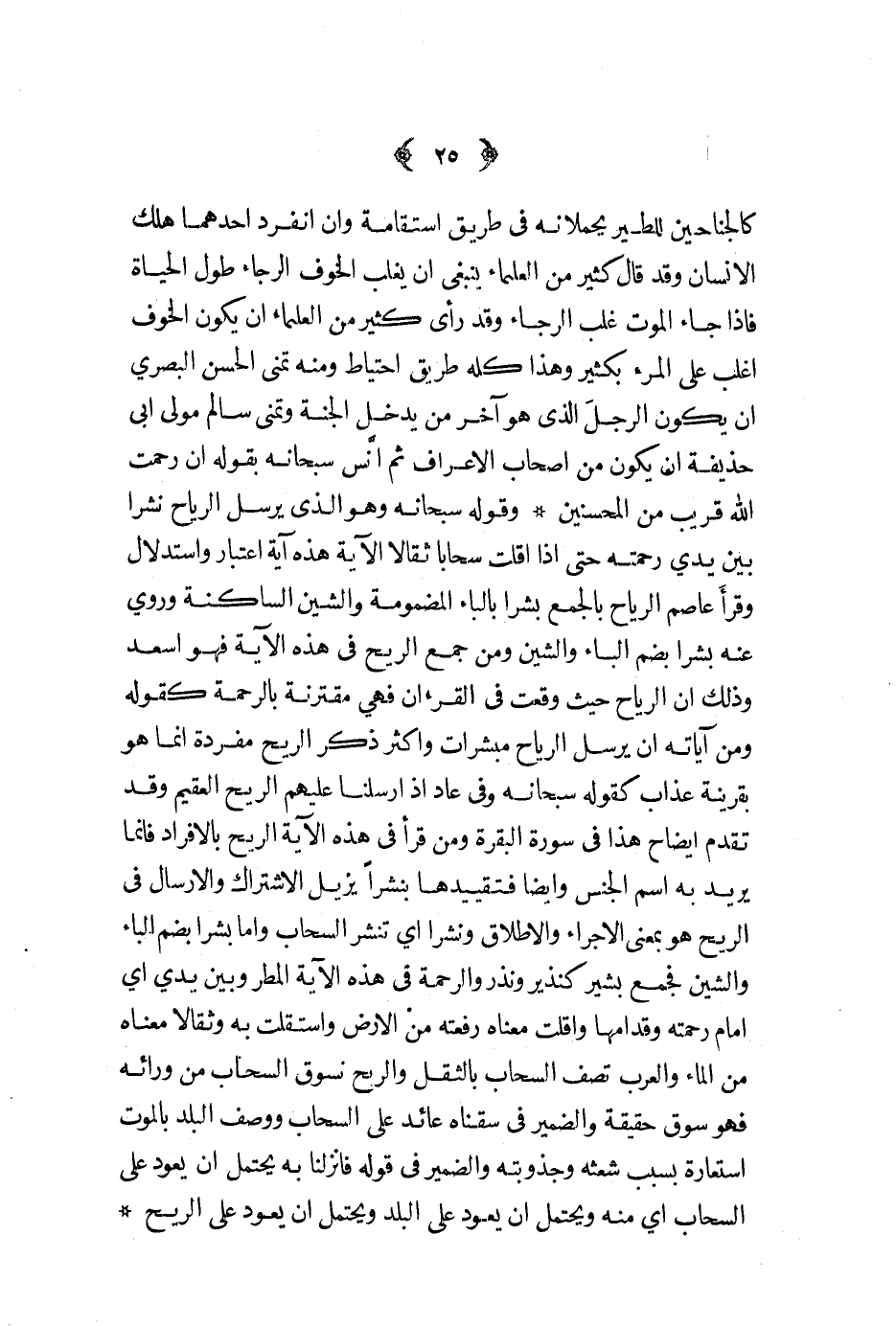 كالجناحين للطير يحملانه في طريق استقامة وان انفرد أحدهما هلك الإنسان وقد قال كثير من العلماء ينبغي أن يغلب الخوف الرجاء طول الحياة فإذا جاء الموت غلب الرجاء وقد رأى كثير من العلماء أن يكون الخوف أغلب على المرء بكثير وهذا كله طريق احتياط ومنه تمنى الحسن البصري أن يكون الرجل الذي هو آخر من يدخل الجنة وتمنى سالم مولى أبي حذيفة أن يكون من أصحاب الأعراف ثم أنس سبحانه بقوله إن رحمت الله قريب من المحسنين