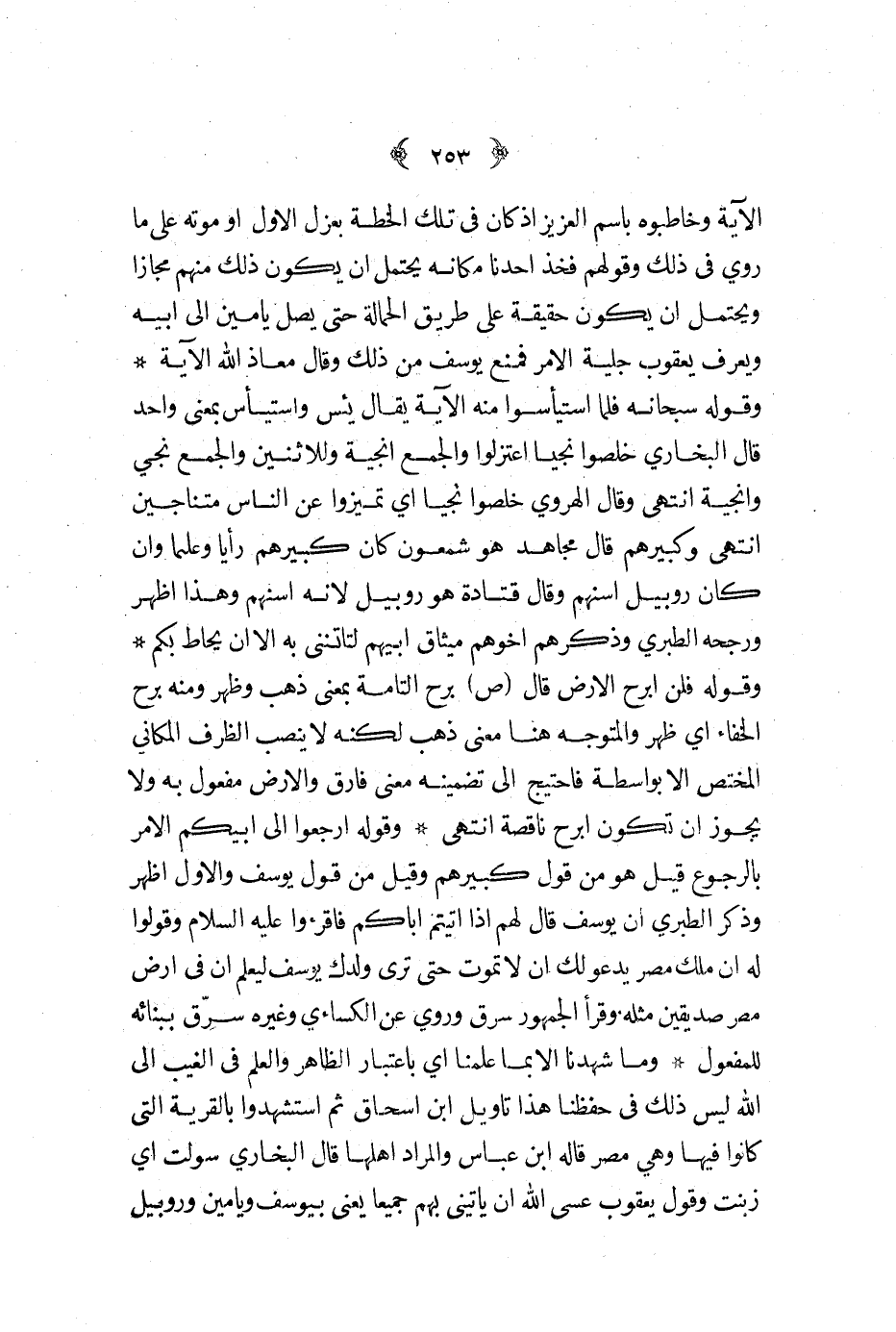 الآية وخاطبوه باسم العزيز إذ كان في تلك الخطة بعزل الأول أو موته علىما روي في ذلك وقوله فخذ أحدنا مكانه يحتمل أن يكون ذلك منهم مجازا ويحتمل أن يكون حقيقة على طريق الحمالة حتى يصل يامين إلى أبيه ويعرف يعقوب جلية الأمر فمنع يوسف من ذلك وقال معاذ الله الآية وقوله سبحانه فلما استيأسوا منه الآية يقا يئس واستيأس بمعنى واحد قال البخاري خلصوا نجيا اعتزلوا والجمع أنجية وللأثنين والجمع نجي وأنجية انتهى وقال الهروي خلصوا نجيا أي تميزوا عن الناس متناجين انتهى وكبيرهم قال مجاهد هو شمعون كان كبيرهم رأيا وعلما وإن كان روبيل أسنهم وقال قتادة هو روبيل لأنه اسنهم وهذا أظهر ورجحه الطبري وذكرهم أخوهم ميثاق أبيهم لتأتننى به إلا أن يحاط بكم وقوله فلن أرح الأرض قال ص برح التامة بمعنى ذهب وظهر ومنه برح الخفاء أي ظهر والمتوجه هنا معنى ذهب لكنه لاينصب الظرف المكاني المختص إلا بواسطة فاحتيج إلى تضمينه معنى فارق والأرض مفعول به ولا يجوز أن تكون ابرح ناقصة انتهى وقوله ارجعوا إلى أبيكم الأمر بالرجوع قيل هو من قول كبيرهم وقيل من قول يوسف والأول أظهر وذكر الطبري أن يوسف قال لهم إذا أتيتم أباكم فاقرءوا عليه السلام وقولوا له إن ملك مصر يدعو لك أن لا تموت حتى ترى ولدك يوسف ليعلم أن في أرض مصر صديقين مثله وقرأ الجمهور سرق وروي عن الكسائي وغيره سرق ببنائه للمفعول وما شهدنا إلا بما علمنا أي باعتبار الظاهر والعلم في الغيب إلى الله ليس ذلك في حفظنا هذا تأويل ابن إسحاق ثم استشهدوا بالقرية التي كانوا فيها وهي مصر قاله ابن عباس والمراد أهلها قال البخاري سولت أي زبنت وقوله يعقوب عسى الله أن يأتيني بهم جميعا يعني بيوسف ويامين وروبيل