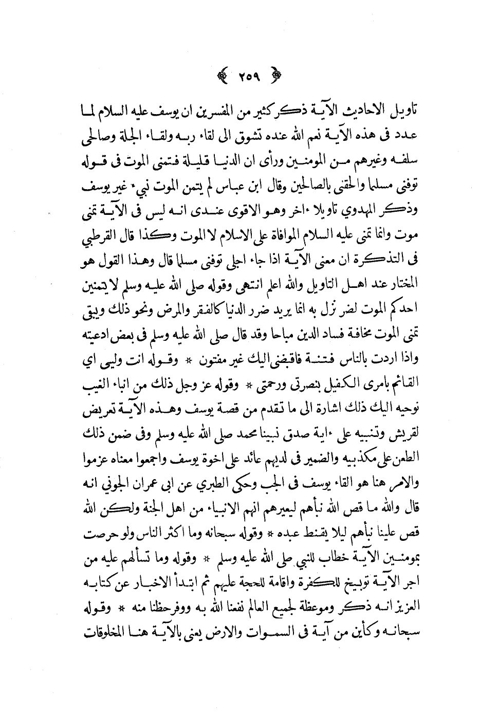 تأويل الأحاديث الآية ذكر كثير من المفسرين أن يوسف عليه السلام لما عدد في هذه الآية نعم الله عنده تشوق إلى لقاء ربه ولقاء الجلة وصالحي سلفه وغيرهم من المؤمنين ورأى أن الدنيا قليلة فتمنى الموت في قوله توفني مسلما والحقني بالصالحين وقال ابن عباس لم يتمن الموت نبيء غير يوسف وذكر المهدوي تأويلا آخر وهو الأقوى عندي أنه ليس في الآية تمني موت وإنما تمنى عليه السلام الموافاة على الإسلام لا الموت وكذا قال القرطبي في التذكرة أن معنى الآية إذا جاء أجلي توفني مسلما قال وهذا القول هو المختار عند أهل التأويل والله أعلم انتهى وقوله صلى الله عليه و سلم لا يتمنين أحدكم الموت لضر نزل به إنما يريد ضرر الدنيا كالفقر والمرض ونحو ذلك ويبقى تمني الموت مخافة فساد الدين مباحا وقد قال صلى الله عليه و سلم في بعض أدعيته وإذا أردت بالناس فتنة فاقبضني إليك غير مفتون