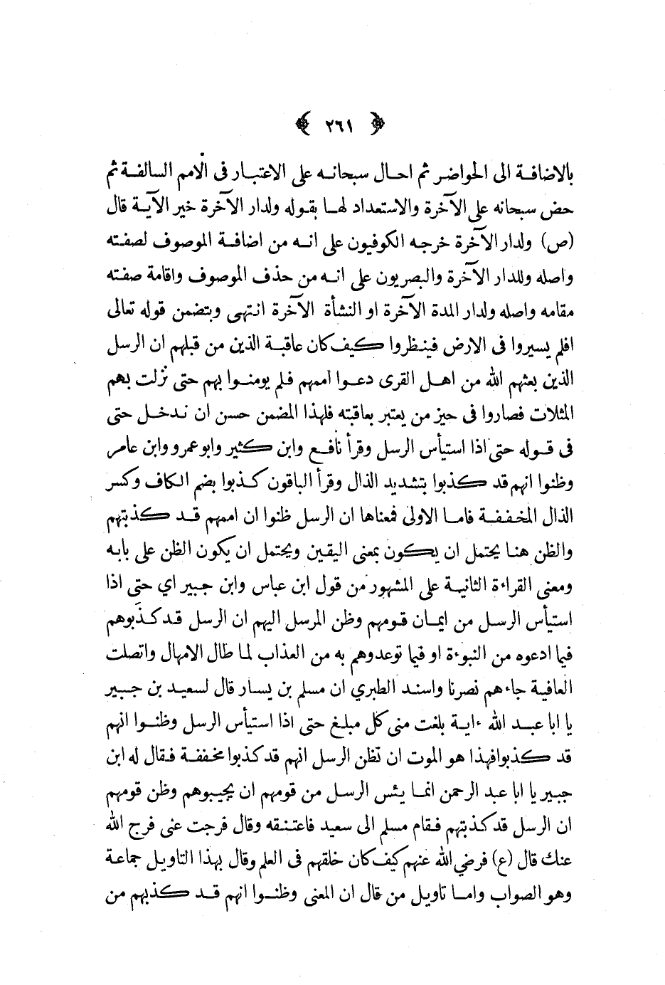 بالإضافة إلى الحواضر ثم أحال سبحانه على الأعتبار في الأمم السالفة ثم حض سبحانه على الآخرة والأستعداد لها بقوله ولدار الآخرة خير الآية قال ص ولدار الآخرة خرجه الكوفيون على أنه من إضافة الموصوف لصفته وأصله وللدار الآخرة والبصريون على أنه من حذف الموصوف وإقامة صفته مقامه وأصله ولدار المدة الآخرة أو النشأة الآخرة انتهى وبتضمن قوله تعالى أفلم يسيروا في الأرض فينظروا كيف كان عاقبة الذين من قبلهم أن الرسل الذين بعثهم الله من أهل القرى دعوا اممهم فلم يؤمنوا بهم حتى نزلت بهم المثلات فصاروا في حيز من يعتبر بعاقبته فلهذا المضمن حسن أن ندخل حتى في قوله حتى إذا استيأس الرسل وقرأ نافع وابن كثير وأبو عمرو وابن عامر وظنوا أنهم قد كذبوا بتشديد الذال وقرأ الباقون كذبوا بضم الكاف وكسر الذال المخففة فأما الأولى فمعناها أن الرسل ظنوا أن أممهم قد كذبتهم والظن هنا يحتمل أن يكون بمعنى اليقين ويحتمل أن يكون الظن على بابه ومعنى القراءة الثانية على المشهور من قول ابن عباس وابن جبير أي حتى إذا استيأس الرسل من إيمان قومهم وظن المرسل إليهم أن الرسل قد كذبوهم فيماأدعوه من النبوة أو فيما توعدوهم به من العذاب لما طال الامهال واتصلت العافية جاءهم نصرنا وأسند الطبري أن مسلم بن يسار قال لسعيد بن جبير يا أبا عبد الله آية بلغت مني كل مبلغ حتى إذا استيأس الرسل وظنوا أنهم قد كذبوا فهذا هو الموت أن تظن الرسل الرسل أنهم قد كذبوا مخففة فقال له ابن جبير يا أبا عبد الرحمن إنما يئس الرسل من قومهم أن يجيبوهم وظن قومهم أن الرسل قد كذبتهم فقام مسلم إلى سعيد فاعتنقه وقال فرجت عني فرج الله عنك قال ع فBهم كيف كان خلقهم في العلم وقال بهذا التأويل جماعة وهو الصواب وأما تأويل من قال أن المعنى وظنوا أنهم قد كذبهم من