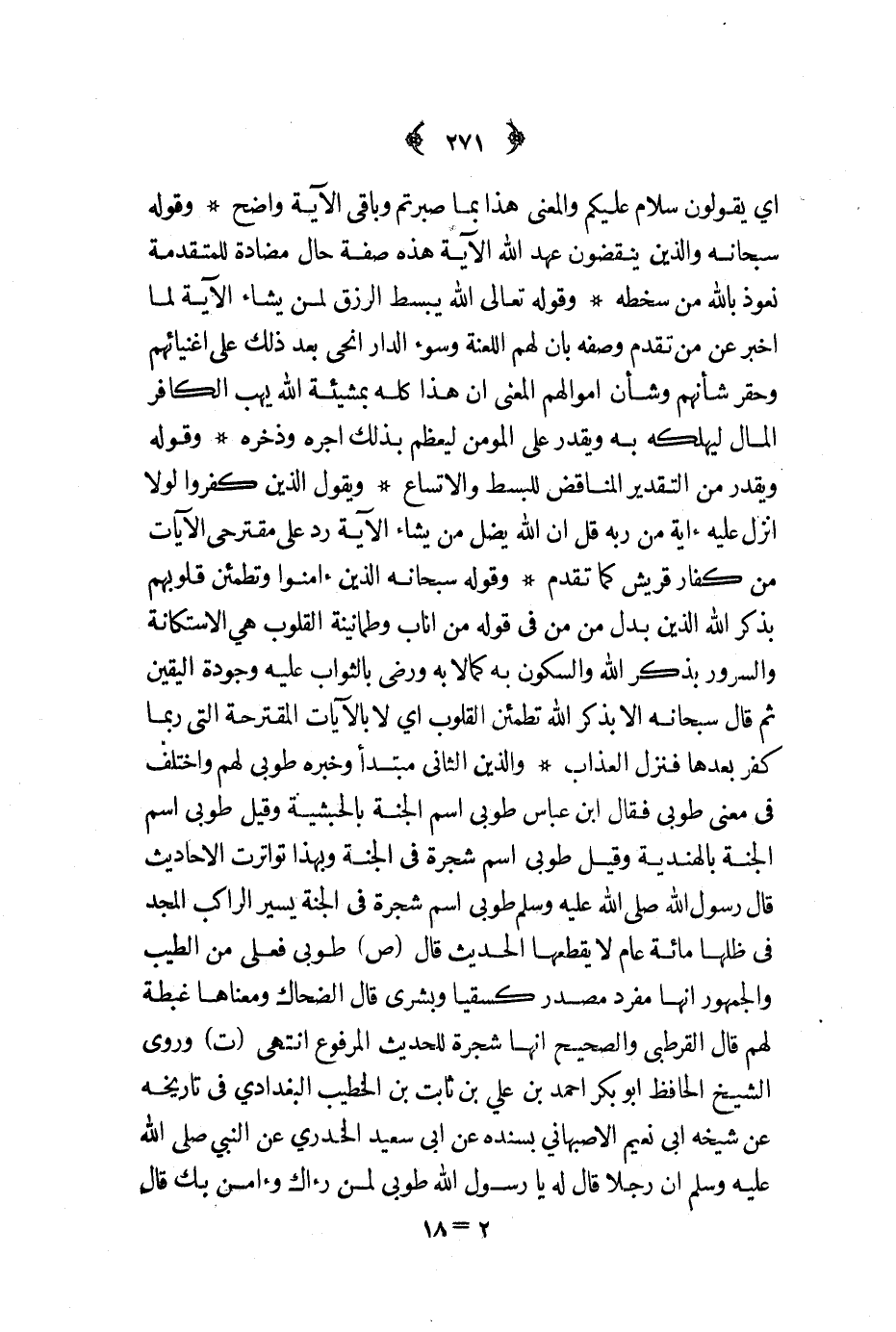 والذين الثاني مبتدأ وخبره طوبى لهم واختلف في معنى طوبى فقال ابن عباس طوبى اسم الجنة بالحبشية وقيل طوبى اسم الجنة بالهندية وقيل طوبى اسم شجرة في الجنة وبهذا تواترت الأحاديث قال رسول الله صلى الله عليه و سلم طوبى اسم شجرة في الجنة يسير الراكب المجد في ظلها مائة عام لا يقطعها الحديث قال ص طوبى فعل من الطيب والجمهور أنهامفردة مصدر كسقيا وبشرى قال الضحاك ومعناها غبطة لهم قال القرطبي والصحيح أنها شجرة للحديث المرفوع انتهى ت وروى الشيخ الحافظ أبو بكر أحمد بن علي بن ثابت بن الخطيب البغدادي في تاريخه عن شيخه أبي نعيم الأصبهاني بسنده عن أبي سعيد الخدري عن النبي صلى الله عليه و سلم أن رجلا قال له يا رسول الله طوبى لمن رآك وآمن بك قال