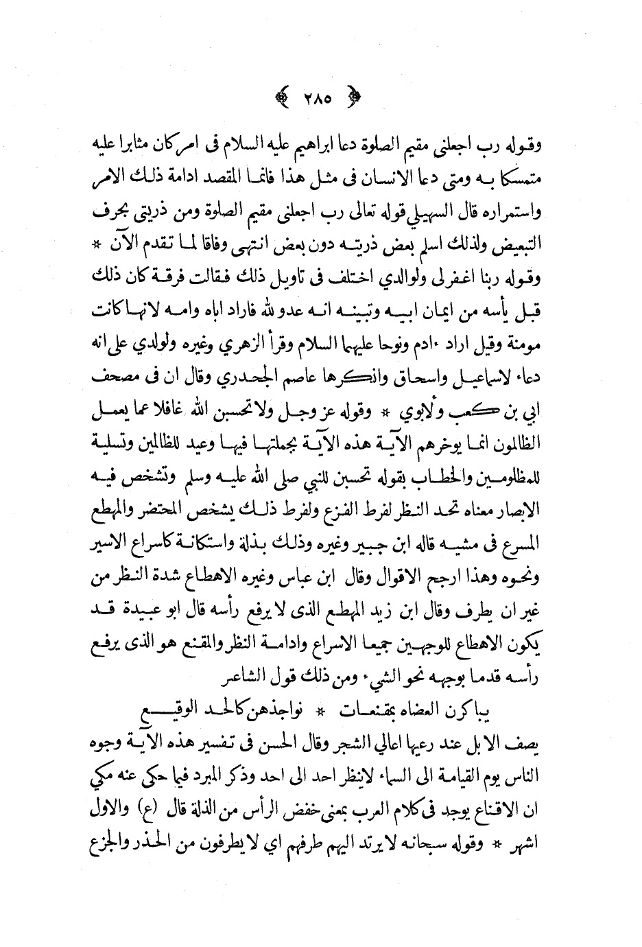 وقوله عز و جل ولا تحسبن الله غافلا عما يعمل الظالمون إنما يوخرهم الآية هذه الآية بجملتها فيها وعيد للظالمين وتسلية للمظلومين والخطاب بقوله تحسبن للنبي صلى الله عليه و سلم وتشخص فيه الأبصار معناه تحد النظر لفرط الفزع ولفرظ ذلك يشخص المحتضر والمهطع المسرع في مشيه قاله ابن جبير وغيره وذلك بذلة واستكانه كاسراع الأسير ونحوه وهذا أرجح الأقوال وقال ابن عباس وغيره الأهطاع شدة النظر من غير أن يطرف وقال ابن زيد المهطع الذي لا يرفع رأسه قال أبو عبيدة قد يكون الأهطاع للوجهين جميعا الأسراع وأدامة النظر والمقنع هوالذي يرفع رأسه قدما بوجهه نحو الشيء ومن ذلك قول الشاعر ... يباكرن العضاه بمقنعات ... نواجذهن كالحد الوقيع ...