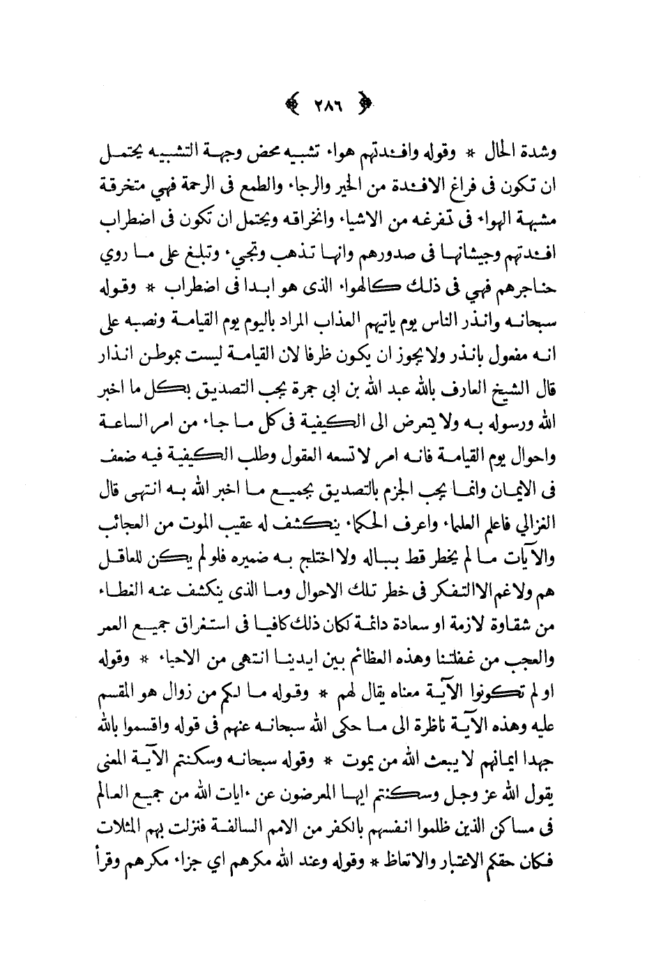 وقوله وافئدتهم هواء تشبيه محض وجهة التشبيه يحتمل أن تكون في فراغ الأفئدة من الخير والرجاء والطمع في الرحمة فهي متخرقة مشبهة الهواء في تفرغه من الأشياء وأنخراقه ويحتمل أن تكون في اضطراب أفئدتهم وجيشانها في صدورهم وأنها تذهب وتجيء وتبلغ على ما روي حناجرهم فهي في ذلك كالهواء الذي هو ابدأ في اضطراب
