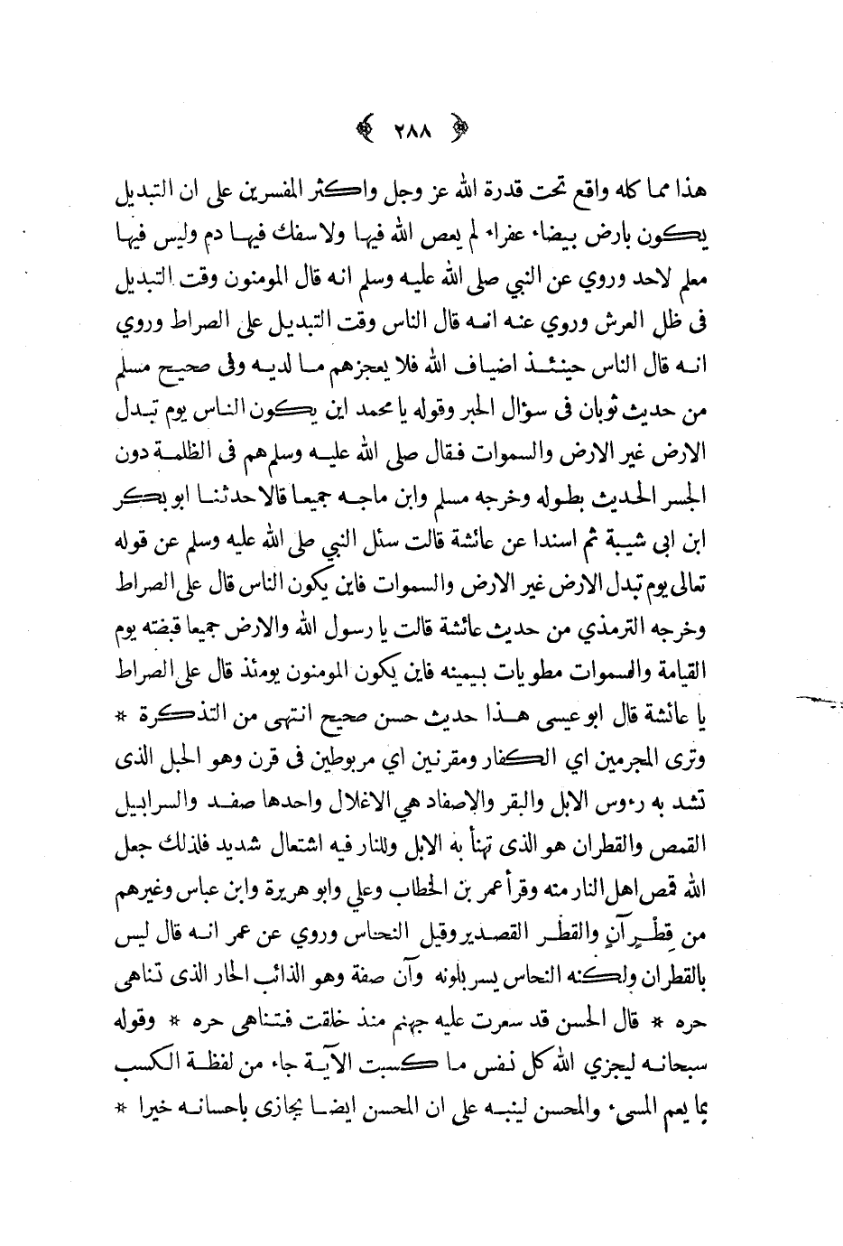 هذا مما كله واقع تحت قدرة الله عز و جل وأكثر المفسرين على أن التبديل يكون بارض بيضاء عفراء لم يعص الله فيها ولا سفك فيها دم وليس فيها معلم لأحد وروي عن النبي صلى الله عليه و سلم أنه قال المؤمنون وقت التبديل في ظل العرش وروي عنه أنه قال الناس وقت التبديل على الصراط وروي أنه قال الناس حينئذ أضياف الله فلا يعجزهم ما لديه وفي صحيح مسلم من حديث ثوبان في سؤال الحبر وقوله يا محمد أين يكون الناس يوم تبدل الأرض غير الأرض والسموات فقال صلى الله عليه و سلم هم في الظلمة دون الجسر الحديث بطوله وخرجه مسلم وأبن ماجه جميعا قالا حدثنا أبو بكر بن ابن أبي شيبة ثم أسندا عن عائشة قالت سئل النبي صلى الله عليه و سلم عن قوله تعالى يوم تبدل الأرض غير الأرض والسموات فأين يكون الناس قال على الصراط وخرجه الترمذي من حديث عائشة قالت يا رسول الله والأرض جميعا قبضته يوم القيامة والسموات مطويات بيمينه فأين يكون المؤمنون يومئذ قال على الصراط يا عائشة قال أبو عيسى هذا حديث حسن صحيح انتهى من التذكرة