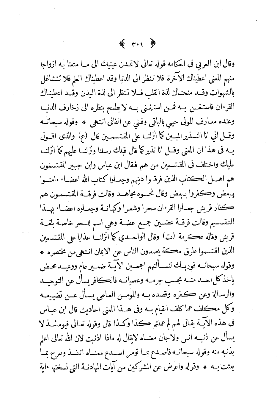 وقوله سبحانه وقل إني أنا النذير المبين كما أنزلنا على المقتسمين قال ع والذين أقول به في هذه أن المعنى وقل أنا نذير كما قال قبلك رسلنا ونزلنا عليهم كما أنزلنا عليك واختلف في المقتسمين من هم فقال ابن عباس وابن جبير المقتسمون هم أهل الكتاب الذي فرقوا دينهم وجعلوا كتاب الله أعضاء آمنوا ببعض وكفروا ببعض وقال لنحوه مجاهد وقالت فرقة المقتسمون هم كفار قريش جعلوا القرآن سحرا وشعرا وكهانة وجعلوه أعضاء بهذا التقسيم وقالت فرقة عضين جميع عضة وهي اسم للسحر خصاة بلغة قريش وقاله عكرمة ت وقال الواحدي كما أنزلنا عذابا على المقتسمين الذي اقتسموا طرق مكة يصدون الناس عن الإيمان انتهى من مختصره