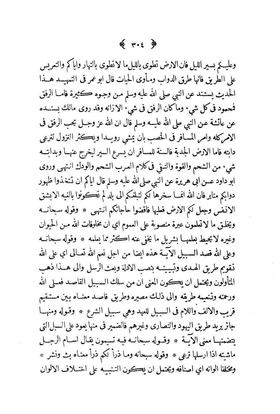 وعليكم بسير الليل فإن الأرض تطوى بالليل ما لا تطوى بالنهار وإياكم والتعريس على الطريق فإنها طرق الدواب ومأوى الحيات قال أبو عمر في التمهيد هذا الحديث يستند عن النبي صلى الله عليه و سلم من وجوه كثيرة فأما الرفق فمحمود في كل شيء وما كان الرفق في شيء إلا زانه وقد روى مالك بسنده عن عائشة عن النبي صلى الله عليه و سلم قال إن الله عز و جل يحب الرفق في الأمر كله وأمر المسافر في الخصب بأن يمشي رويدا ويكثر النزول لترعى دابته فأما الأرض الجدبة فالسنة للمسافر أن يسرع السير ليخرج عنها وبدابته شيء من الشحم والقوة والنقي في كلام العرب الشحم والودك انتهى وروى أبو داود عن أبي هريرة عن النبي صلى الله عليه و سلم قال إياكم أن تتخذوا ظهور دوابكم منابر فإن الله إنما سخرها لكم لتبلغكم إلى بلد لم تكونوا بالغيه إلا بشق الأنفس وجعل لكم الأرض فعليها فاقضوا حاجاتكم انتهى