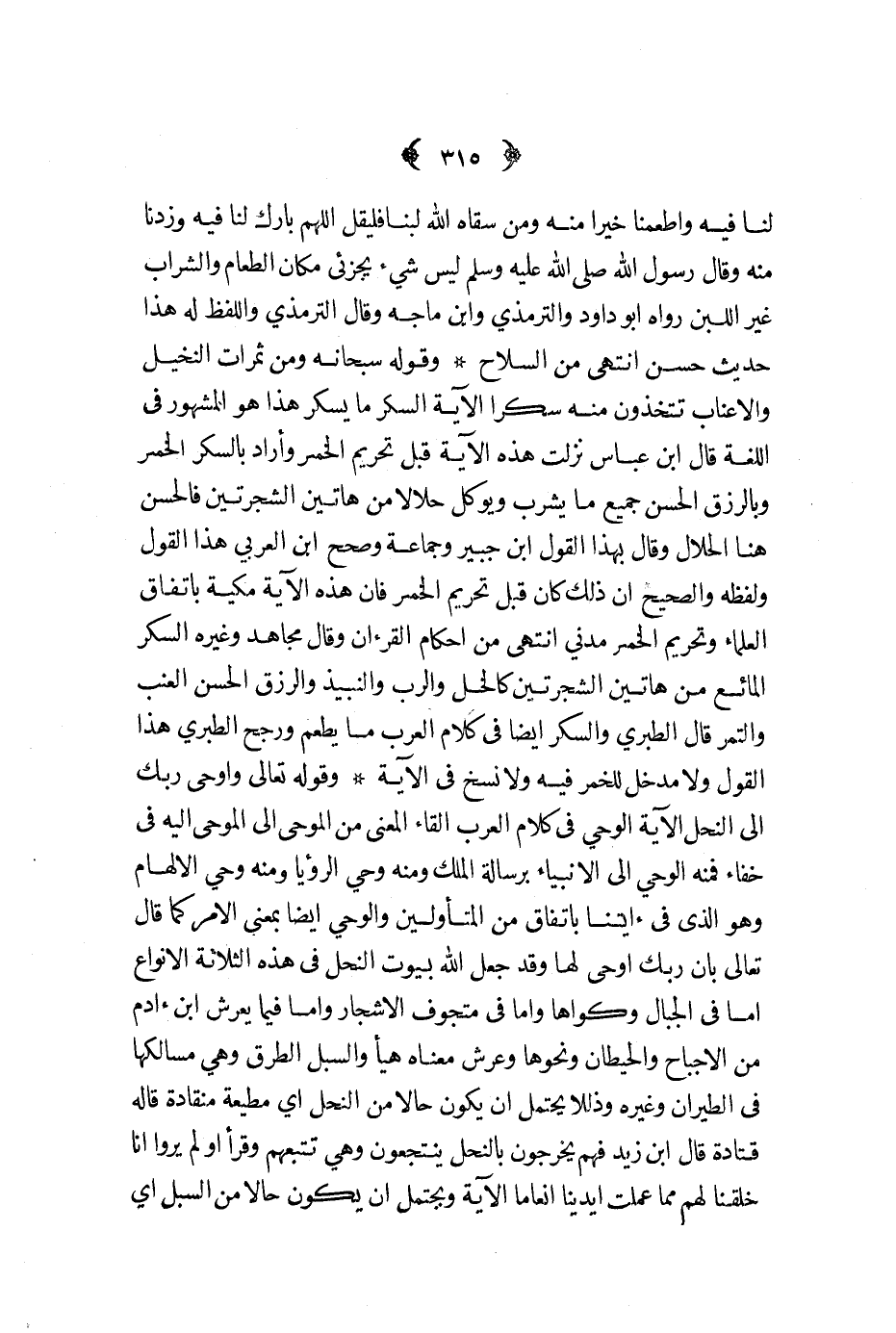 وقوله سبحانه ومن ثمرات النخيل والاعناب تتخذون منه سكرا الآية السكر ما يسكر هذا هوا لمشهور في اللغة قال ابن عباس نزلت هذه الآية قبل تحريم الخمر وأراد بالسكر الخمر وبالرزق الحسن جميع ما يشرب ويؤكل حلالا من هاتين الشجرتين فالحسن هنا الحلال وقال بهذا القول ابن جبير وجماعة وصحح ابن العربي هذا القول ولفظه والصحيح أن ذلك كان قبل تحريم الخمر فإن هذه الآية مكية باتفاق العلماء وتحريم الخمر مدني انتهى من أحكام القرآن وقال مجاهد وغيره السكر المائع من هاتين الشجرتين كالخل والرب والنبيذ والرزق الحسن العنب والتمر قال الطبري والسكر أيضا في كلام العرب ما يطعم ورجح الطبري هذا القول ولا مدخل للخمر فيه ولا نسخ في الآية