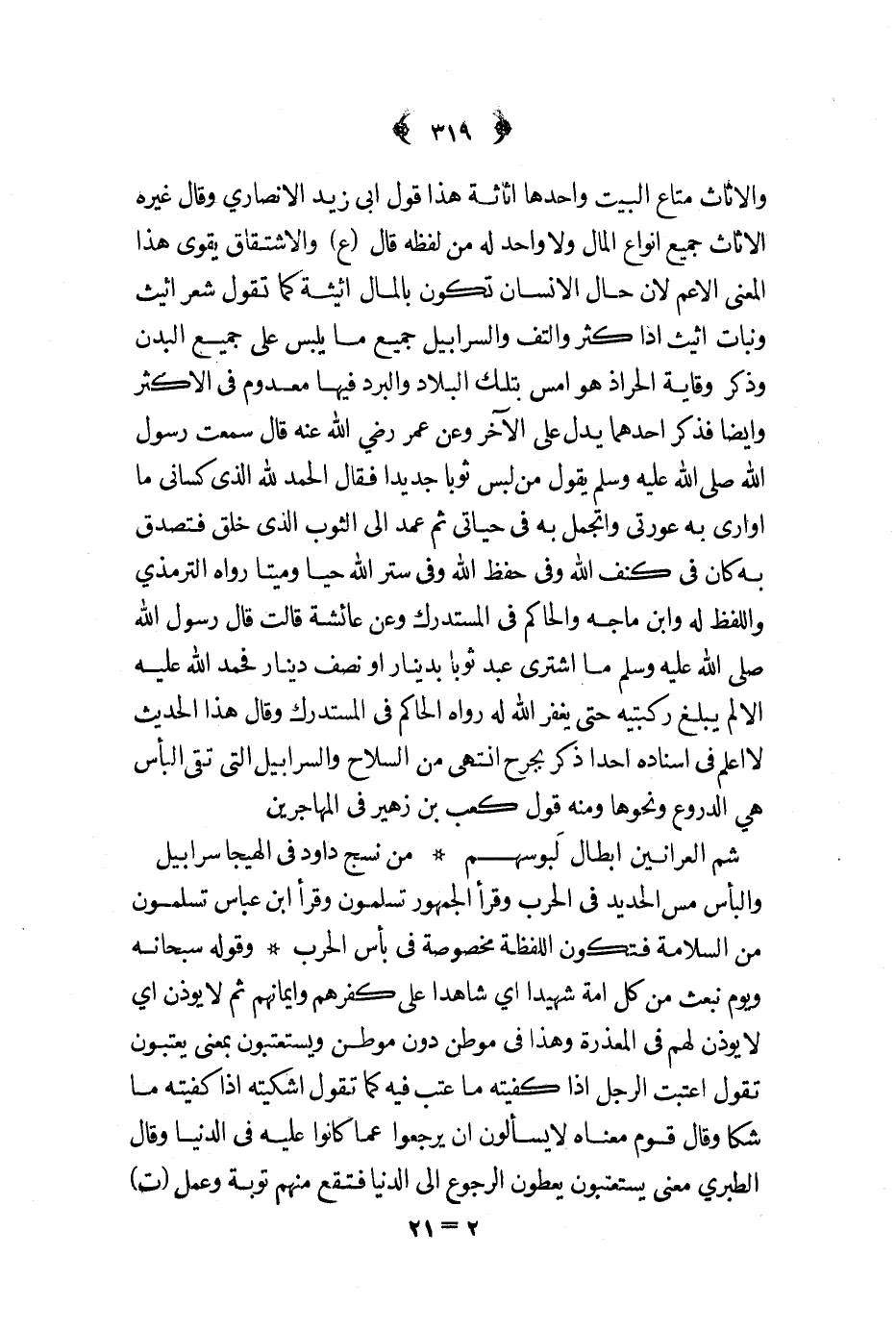 والأثاث متاع البيت وأحدها أثاثه هذا قول أبي زيد الأنصاري وقال غيره الأثاث جميع أنواع المال ولا واحد له من لفظه قال ع والاشتقاق يقوي هذا المعنى الأعم لأن حال الإنسان تكون بالمال اثيثة كما تقول شعر أثيث ونبات أثيث إذا كثر والتف والسرابيل جميع ما يلبس على جميع البدن وذكر وقاية الحراذ هوأمس بتلك البلاد والبرد فيها معدوم في الأكثر وأيضا فذكر أحدهما يدل على الآخر وعن عمر رضي الله عنه قال سمعت رسول الله صلى الله عليه و سلم يقول من لبس ثوبا جديد فقال الحمد لله الذي كساني ما أواري به عورتي وأتجمل به في حياتي ثم عمد إلى الثوب الذي خلق فتصدق به كان في كنف الله وفي حفظ الله وفي ستر الله حيا وميتا رواه الترمذي واللفظ له وابن ماجه والحاكم في المستدرك وعن عائشة قالت قال رسول الله صلى الله عليه و سلم ما اشترى عبد ثوبا بدينا أو نصف دينا فحمد الله عليه إلا لم يبلغ ركبتيه حتى يغفر الله له رواه الحاكم في المستدرك وقال هذا الحديث لا أعلم في إسناده أحدا ذكر بجرح انتهى من السلاح والسرابيل التي تقي البأس هي الدروع ونحوها ومنه قول كعب بن زهير في المهاجرين ... شم العرانين أبطال لبوسهم ... من نسبج داود في الهيجا سرابيل ...