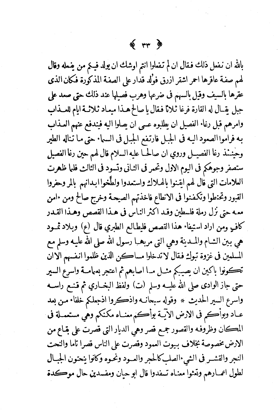 بالله أن نفعل ذلك فقال إن لم تفعلوا أنتم أوشك أن يولد فيكم من يفعله وقال لهم صفة عاقرها أحمر أشقر أزرق فولد قدار على الصفة المذكورة فكان الذي عقرها بالسيف وقيل بالسهم في ضرعها وهرب فصيلها عند ذلك حتى صعد على جبل يقال له القارة فرغا ثلاثا فقال يا صالح هذا ميعاد ثلاثة أيام للعذاب وأمرهم قبل رغاء الفصيل أن يطلبوه عسى أن يصلوا إليه فيندفع عنهم العذاب به فراموا الصعود إليه في الجبل فارتفع الجبل في السماء حتى ما تناله الطير وحينئذ رغا الفصيل وروي أن صالحا عليه السلام قال لهم حين رغا الفصيل ستصفر وجوهكم في اليوم الأول وتحمر في الثاني وتسود في الثالث فلما ظهرت العلامات التي قال لهم أيقنوا بالهلاك واستعدوا ولطخوا ابدانهم بالمر وحفروا القبور وتحنطوا وتكفنوا في الأنطاع فأخذتهم الصيحة وخرج صالح ومن آمن معه حتى نزل رملة فلسطين وقد اكثر الناس في هذا القصص وهذا القدر كاف ومن أراد استيفاء هذا القصص فليطالع الطبري قال ع وبلاد ثمود هي بين الشام والمدينة وهي التي مر بها رسول الله صلى الله عليه و سلم مع المسلمين في غزوة تبوك فقال لا تدخلوا مساكن الذين ظلموا أنفسهم إلا أن تكونوا باكين أن يصيبكم مثل ما أصابهم ثم اعتجر بعمامة وأسرع السير حتى جاز الوادي صلى الله عليه و سلم ت ولفظ البخاري ثم قنع رأسه وأسرع السير الحديث