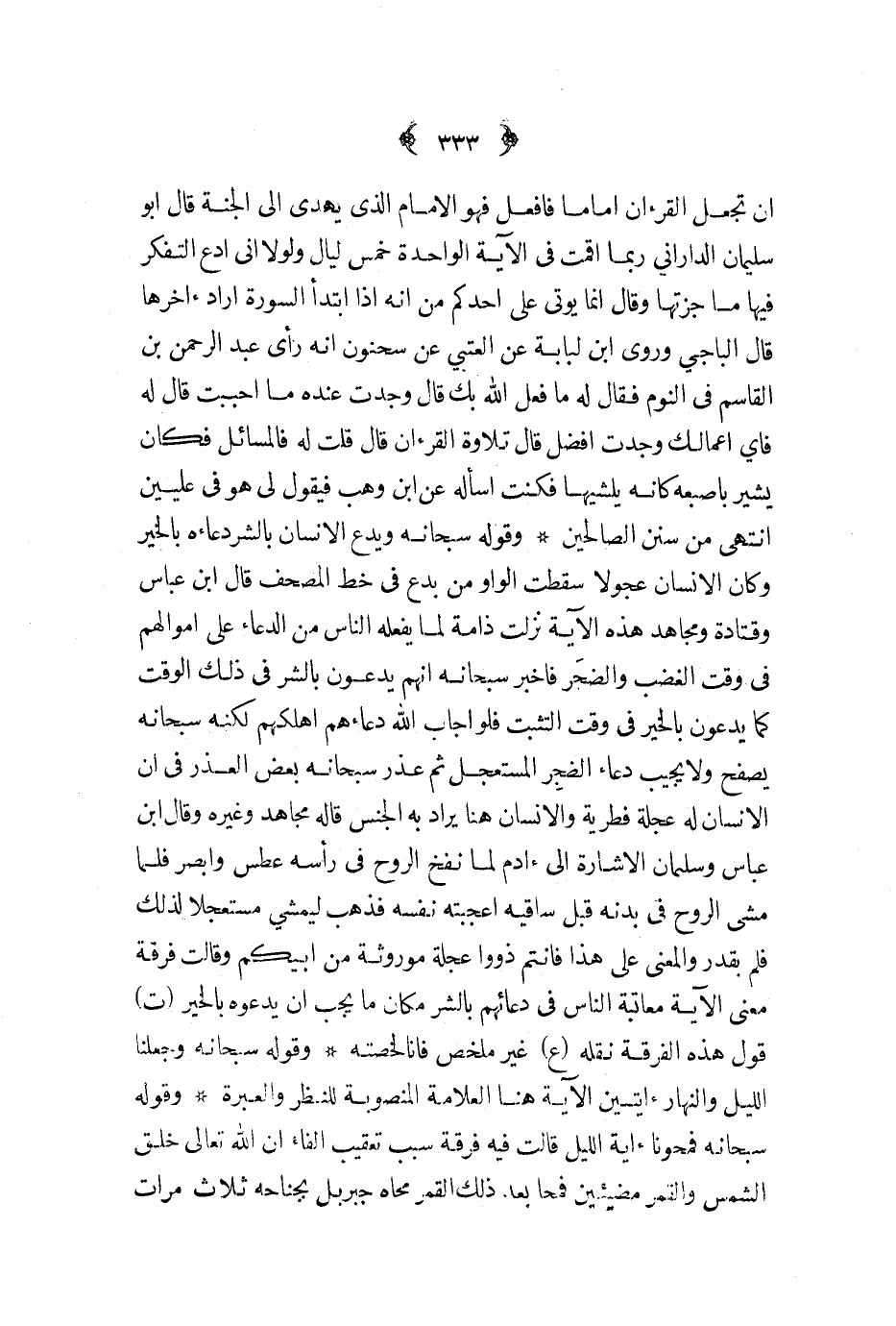 أن تجعل القرآن إماما فأفعل فهو الأمام الذي يهدي إلى الجنة قال أبو سليمان الداراني ربما أقمت في الآية الواحدة خمس ليال ولولا أني ادع التفكر فيها ما جزتها وقال إنما يؤتى على أحدكم من أنه إذا ابتدأ السورة أراد آخرها قال الباجي وروى ابن لبابة عن العتبي عن سحنون أنه رأى عبد الرحمن بن القاسم في النوم فقال له ما فعل الله بك قال وجدت عنده ما أحببت قال له فأي أعمالك وجدت أفضل قال تلاوة القرآن قال قلت له فالمسائل فكان يشير بأصبعه كأنه يلشيها فكنت اسأله عن ابن وهب فيقول لي هو في عليين انتهى من سنن الصالحين