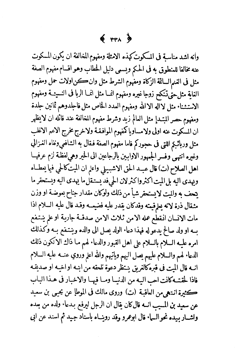 وانه أشد مناسبة في المسكوت كهذه الأمثلة ومفهوم المخالفة أن يكون المسكوت عنه مخالفا للمنطوق به في الحكم ويسمى دليل الخطاب وهو أقسام مفهوم الصفة مثل في الغنم السائمة الزكاة ومفهوم الشرط مثل وأن كن أولات حمل ومفهوم الغاية مثل حتى تنكح زوجا غيره ومفهوم إنما مثل إنما الربا في النسيئة ومفهوما الاستنثاء مثل لا إله إلا الله ومفهوم العدد الخاص مثل فاجلدوهم ثمانين جلدة ومفهوم حصر المبتدأ مثل العالم زيد وشرط مفهوم المخالفة عند قائله ان لا يظهر أن المسكوت عنه أولى ولا مساويا كمفهوم الموافقة ولا خرج مخرج الأعم الأغلب مثل وربائبكم اللتي في حجوركم فأما مفهوم الصفة فقال به الشافعي ونفاه الغزالي وغره انتهى وفسر الجمهور الأوابين بالرجاعين إلىالخير وهي لفظة لزم عرفها أهل الصلاح ت قال عبد الحلق الأشبيلي واعلم أن الميت كالحي فيما يعطاه ويهدى إليه بل الميت أكثر وأكثر لأن الحي قد يستقل مايهدى إليه ويستحقر ما يتحف به والميت لا يستحقر شيئا من ذلك ولو كان مقدار جناح بعوضة أو وزن مثال ذرة لأنه يعلم قيمته وقد كان يقدر عليه فضيعه وقد قال عليه السلام إذا مات الإنسان انقطع عمله إلا من ثلاث إلا من صدقة جارية أو علم ينتفع به أو ولد صالح يدعو له فهذا دعاء الولد يصل إلى والده وينتفع به وكذلك امره عليه السلام بالسلام على أهل القبور والدعاء لهم ما ذاك إلا لكون ذلك الدعاء لهم والسلام عليهم يصل إليهم ويأتيهم والله أعلم وروي عنه عليه السلام أنه قال الميت في قبره كالغريق ينتظر دعوة تلحقه من ابنه أو أخيه أو صديقه فإذا لحقته كانت أحب إليه من الدنيا وما فيها والأخبار في هذا الباب كثيرة انتهى من العاقبة ت وروى مالك في الموطأ عن يحيى بن سعيد عن سعيد بن المسيب أنه قال كان يقال أن الرجل ليرفع بدعاء ولده من بعده واشار بيده نحو السماء قال أبو عمر وقد رويناه بإسناد جيد ثم أسند عن أبي