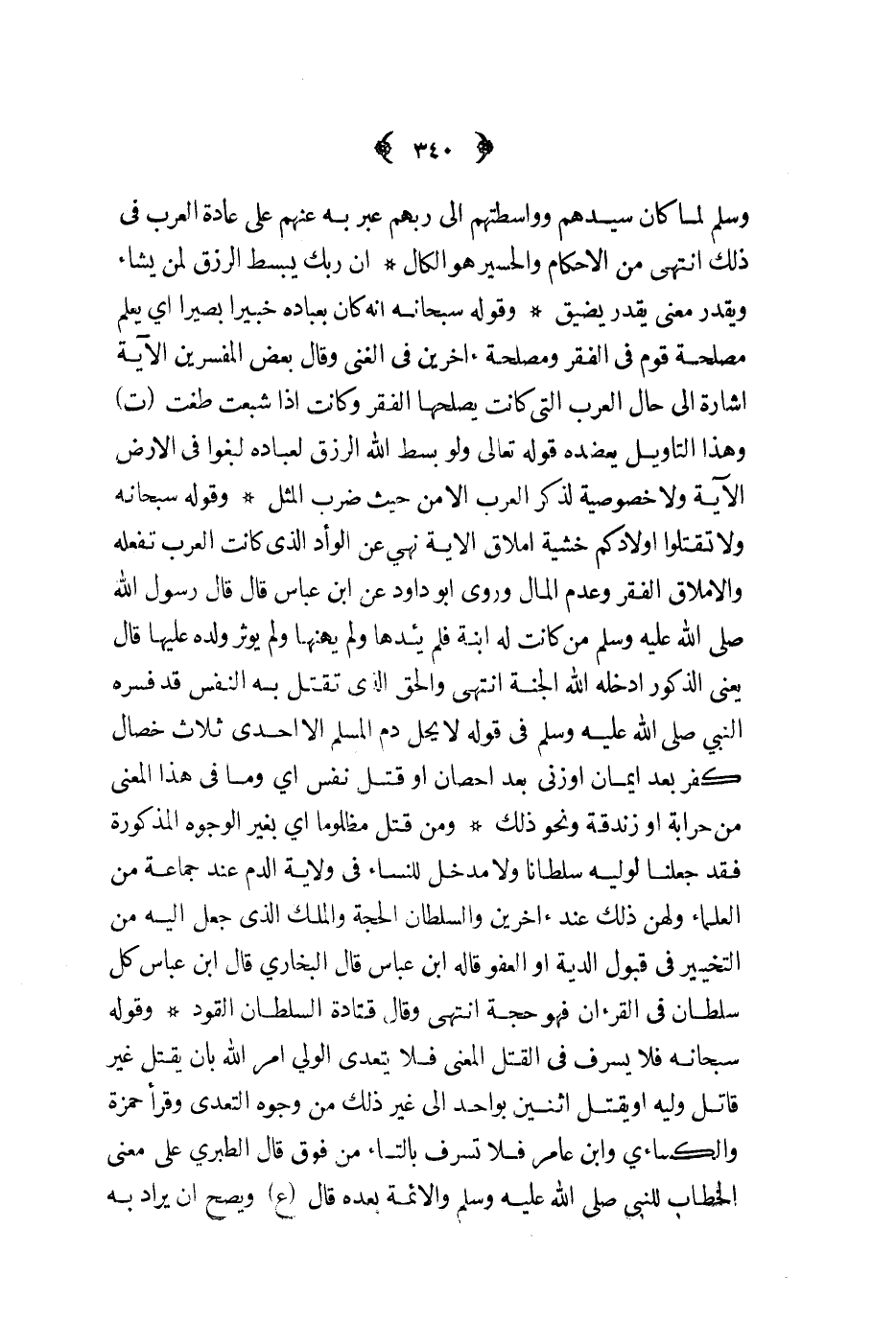 وقوله سبحانه ولا تقتلوا أولادكم خشية املاق الآية نهي عن الوأد الذي كانت العرب تفعله والإملاق الفقر وعدم المال وروى أبو داود عن ابن عباس قال قال رسول الله صلى الله عليه و سلم من كانت له ابنة فلم يئدها ولم يهنها ولم يوثر ولده عليها قال يعني الذكور أدخله الله الجنة انتهى والحق الذي تقتل به النفس قد فسره النبي صلى الله عليه و سلم في قوله لا يحل دم المسلم إلا أحدى ثلاث خصال كفر بعد إيمان أو زنى بعد إحصان أو قتل نفس أي وما في هذا المعنى من حرابة أو زندقة ونحو ذلك