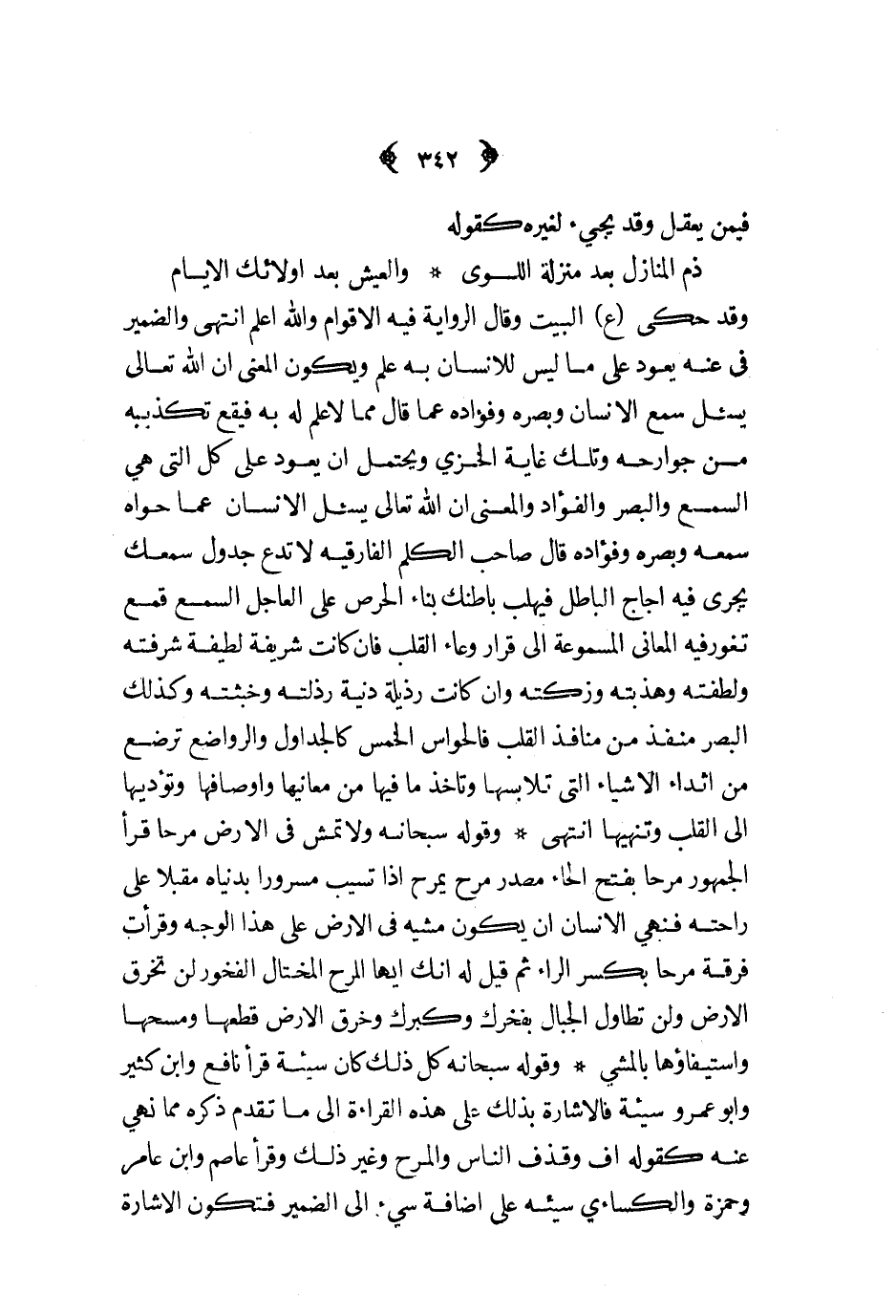 وقد حكى ع البيت وقال الرواية فيه الأقوام واله أعلم انتهى والضمير في عنه يعد على ما ليس للإنسان به علم ويكون المعنى أن الله تعالى يسئل سمع الإنسان وبصره وفؤاده عما قال مما لا علم له به فيقع تكذيبه من جوارحه وتلك غاية الخزي ويحتمل أن يعود على كل التي هي السمع والبصر والفؤاد والمعنى أن الله تعالى يسئل الإنسان عما حواه سمعه وبصره وفؤاده قال صاحب الكلم الفارقيه لا تدع جدول سمعك يجري في اجاج الباطل فيهلب باطنك بناء الحرص على العاجل السمع قمع تغور فيه المعاني المسموعة إلى قرار وعاء القلب فإن كانت شريفة لطيفة شرفته ولطفته وهذبته وزكته وإن كانت رذيلة دنية رذلته وخبثته وكذلك البصر منفذ من منافذ القلب فالحواس الخمس كالجداول والرواضع ترضع من اثداء الأشياء التي تلابسها وتأخذ ما فيها من معانيها وأوصافها وتؤديها إلى القلب وتنهيها انتهى