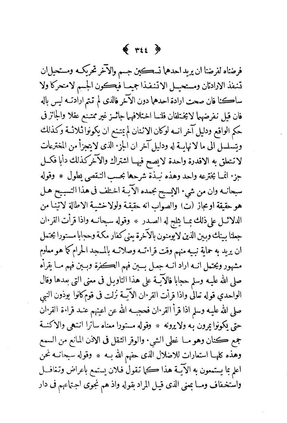 فرضناه لفرضنا أني يريد أحدهما تسكين جسم والآخر تحريكه ومستحيل أن تنفذ الارادتان ومستحيل الا تنفذا جميعا فيكون الجسم لا متحركا ولا ساكنا فإن صحت ارادة أحدهما دون الآخر فالذي لم تتم ارادته ليس باله فإن قيل نفرضهما لا يختلفان قلنا اختلافهما جائز غير ممتنع عقلا والجائز في حكم الواقع ودليل آخر أنه لو كان الأثنان لم يمتنع أن يكونوا ثلاثة وكذلك وتسلسل إلى ما لا نهاية له ودليل آخر أن الجزء الذي لا يتجزأ من المخترعات لا تتعلق به الاقدرة واحدة لا يصح فيها اشتراك والآخر كذلك دأبا فكل جزء إنما يخترعه واحد وهذه نبذة شرحها بحسب التقصي يطول