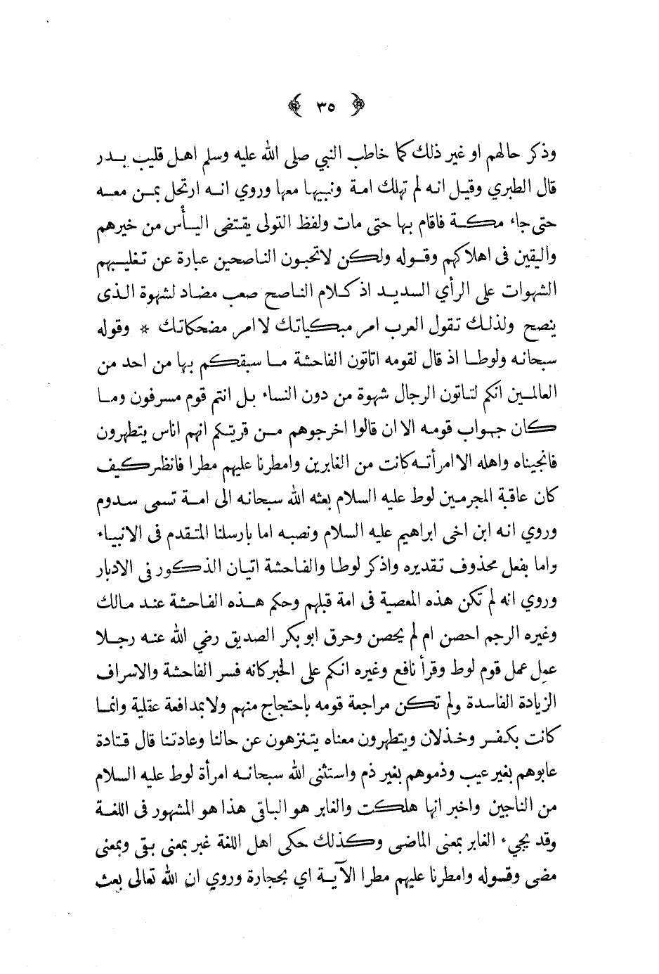 وقوله سبحانه ولوطا إذ قال لقومه أتأتون الفاحشة ما سبقكم بها من أحد من العالمين إنكم لتأتون الرجال شهوة من دون النساء بل أنتم قوم مسرفون وما كان جواب قومه إلا أن قالوا أخرجوهم من قريتكم إنهم أناس يتطهرون فأنجيناه وأهله إلا امرأته كانت من الغابرين وأمطرنا عليهم مطرا فانظر كيف كان عاقبة المجرمين لوط عليه السلام بعثه الله سبحانه إلى أمة تسمى سدوم وروي أنه ابن أخي إبراهيم عليه السلام ونصبه إما بارسلنا المتقدم في الأنبياء وأما بفعل محذوف تقديره واذكر لوطا والفاحشة إتيان الذكور في الأدبار وروي أنه لم تكن هذه المعصية في أمة قبلهم وحكم هذه الفاحشة عند مالك وغيره الرجم أحصن أم لم يحصن وحرق أبو بكر الصديق رضي الله عنه رجلا عمل عمل قوم لوط وقرأ نافع وغيره إنكم على الخبر كأنه فسر الفاحشة والإسراف الزيادة الفاسدة ولم تكن مراجعة قومه باحتجاج منهم ولا بمدافعة عقلية وإنما كانت بكفر وخذلان و يتطهرون معناه يتنزهون عن حالنا وعادتنا قال قتادة عابوهم بغير عيب وذموهم بغير ذم واستثنى الله سبحانه امرأة لوط عليه السلام من الناجين وأخبر أنها هلكت والغابر هو الباقي هذا هو المشهور في اللغة وقد يجيء الغابر بمعنى الماضي وكذلك حكى أهل اللغة غبر بمعنى بقي وبمعنى مضى وقوله و أمطرنا عليهم مطرا الآية أي بحجارة وروي أن الله تعالى بعث