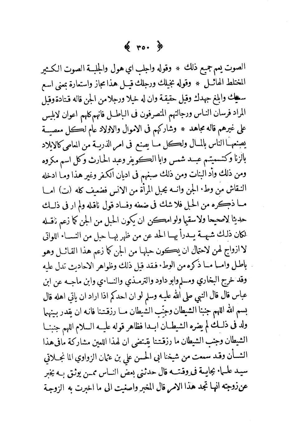 وشاركهم في الأموال والأولاد عام لكل معصية يصنعها الناس بالمال ولكل ما يصنع في أمر الذرية من المعاصي كالايلاد بالزنا وكتسميتهم عبد شمس وأبا الكويفر وعبد الحارث وكل اسم مكروه ومن ذلك وأد البنات ومن ذلك صبغهم في أديان الكفر وغير هذا وما أدخله النقاش من وطء الجن وأنه يحبل المرأة من الأنس فضعيف كله ت أما ذكره من الحبل فلا شك في ضعفه وفساد قول ناقله ولم أر في ذلك حديثا لا صحيحا ولا سقيما ولو أمكن أن يكون الحبل من الجن كما زعم ناقله لكان ذلك شبهة يدرأ بها الحد عن من ظهر بها حبل من النساء اللواتي لا أزواج لهن لأحتمال أن يكون حبلها من الجن كما زعم هذا القائل وهو باطل وأما ما ذكره من الوطء فقد قيل ذلك وظواهر الأحاديث تدل عليه وقد خرج البخاري ومسلم وأبو داود والترمذي والنسائي وابن ماجه عن ابن عباس قال قال النبي صلى الله عليه و سلم لو أن أحدكم إذا أراد أن يأتي أهله قال بسم الله اللهم جنبنا الشيطان وجنب الشيطان ما رزقتنا فإنه أن يقدر بينهما الشيطان وجنب الشيطان ما رزقتنا يقتضي أن لهذا اللعين مشاركة ما في هذا الشأن وقد سمعت من شيخنا أبي الحسن علي بن عثمان الزواوي المانجلاتي سيد علماء بجاية في وقته قال حدثني بعض الناس ممن يوثق به يخبر عن زوجته أنها تجد هذا الأمر قال المخبر واصغيت إلى ما أخبرت به الزوجة