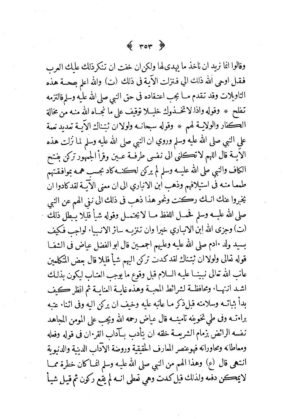 وقوله سبحانه ولولا أن ثبتناك الآية تعديد نعمة على النبي صلى الله عليه و سلم وروي أن النبي صلى الله عليه و سلم لما نزلت هذه الآية قال اللهم لا تكلني إلى نفسي طرفة عين وقرأ الجمهور تركن بفتح الكاف والنبي صلى الله عليه و سلم لم يركن لكنه كاد بحسب همه بموافقتهم طمعا منه في استيلافهم وذهب ابن الأنباري إلى أن معنى الآية لقد كادوا أن يخبروا عنك أنك ركنت ونوح هذا ذهب في ذلك إلى نفي الهم عن النبي صلى الله عليه و سلم فحمل اللفظ ما لايحتمل وقوله شيئا قليلا يبطل ذلك ت وجزى الله ابن الأنباري خيرا وأن تنزيه سائر الأنبياء لواجب فكيف بسيد ولد آدم صلى الله عليه و سلم وعليهم أجمعين قال أبو الفضل عياض في الشفا قوله تعالى ولولا أن ثبتناك لقد كدت تركن إليهم شيءا قليلا قال بعض المتكلمين عاتب الله تعالى نبينا عليه السلام قبل وقوع ما يوجب العتاب ليكون بذلك أشد انتهاء ومحافظة لشرائط المحبة وهذه غاية العناية ثم أنظر كيف بدأ بثباته وسلامته قبل ذكر ما عاتبه عليه وخيف أن يركن إليه وفي أثناء عتبه براءته وفي طي تخويفه تأمينه قال عياض رحمه الله ويجب على المؤمن المجاهد نفسه الرائض بزمام الشريعة خلقه أن يتأدب بآدات القرآن في قوله وفعله ومعاطاته ومحاوراته فهو عنصر المعارف الحقيقية وروضة الآداب الدينية والدنيوية انتهى قال ع وهذا الهم من النبي صلى الله عليه و سلم إنما كان خطرة مما لا يمكن دفعه ولذلك قيل كدت وهي تعطي أنه لم يقع ركون ثم قيل شيئا