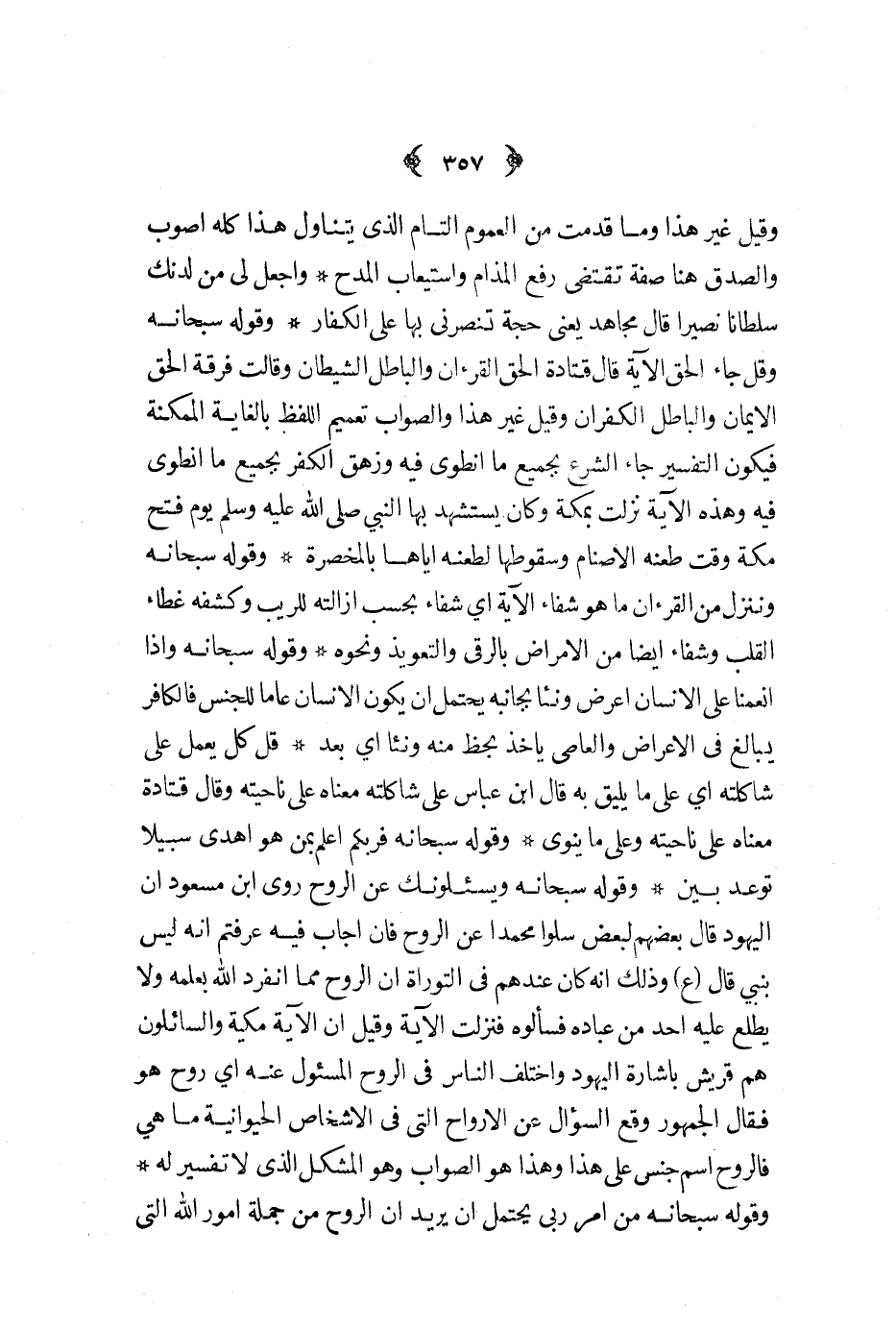 وقوله سبحانه ويسئلونك عن الروح روى ابن مسعود أن اليهود قال بعضهم لبعض سلوا محمد عن الروح فإن أجاب فيه عرفتم أنه ليس بنبي قال ع وذلك أنه كان عندهم في التوراة أن الروح مما أنفرد الله بعلمه ولا يطلع عليه أحد من عباده فسألوه فنزلت الآية وقيل أن الآية مكية والسائلون هم قريش بإشارة اليهود واختلف الناس في الروح المسئول عنه أي روح هو فقال الجمهور وقع السؤال عن الأرواح التي في الأشخاص الحيوانية ما هي فالروح اسم جنس على هذا وهذا هو الصواب وهو المشكل الذي لا تفسير له
