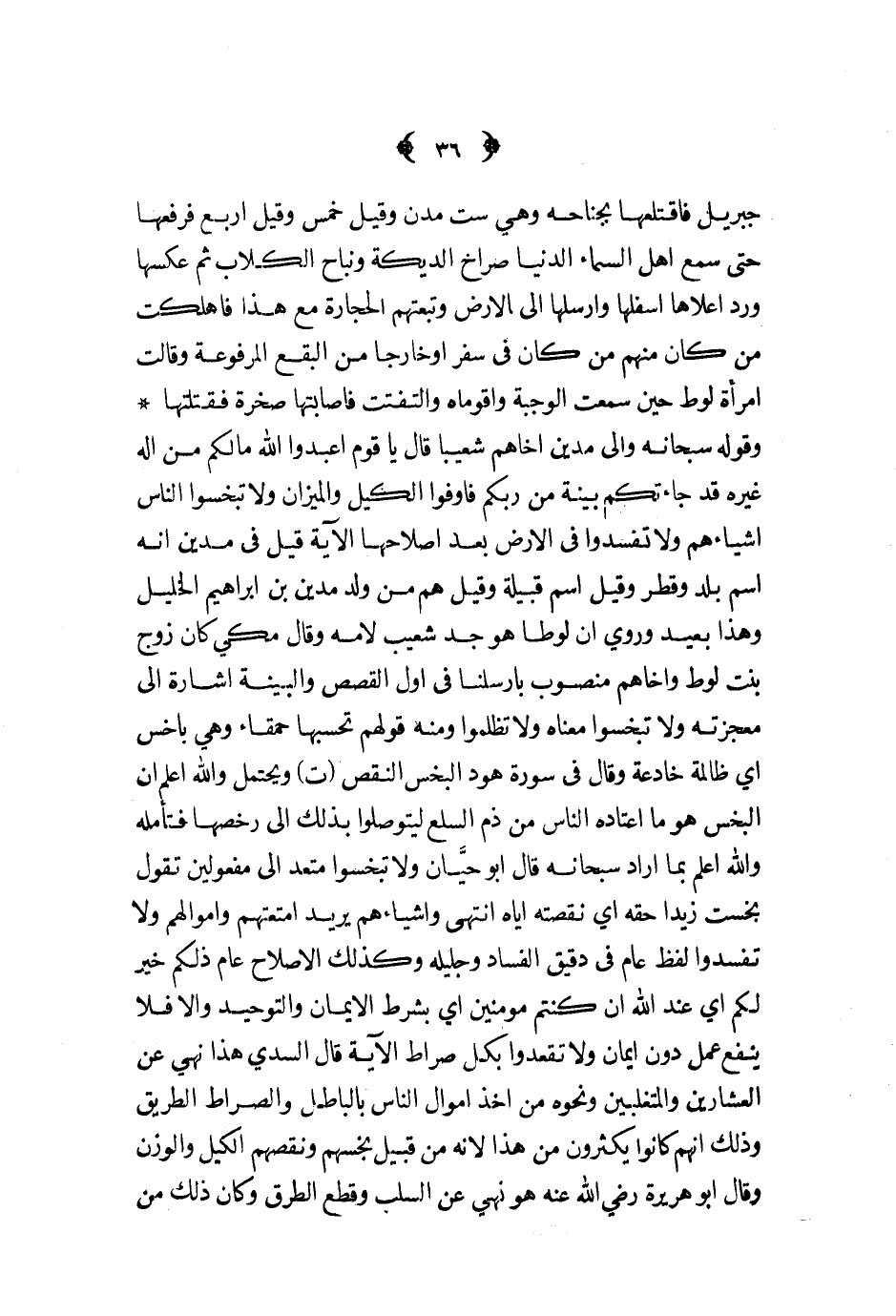 وقوله سبحانه وإلى مدين أخاهم شعيبا قال يا قوم اعبدوا الله ما لكم من اله غيره قد جاءتكم بينة من ربكم فأوفوا الكيل والميزان ولا تبخسوا الناس أشيائهم ولا تفسدوا في الأرض بعد إصلاحها الآية قيل في مدين أنه اسم بلد وقطر وقيل اسم قبيلة وقيل هم من ولد مدين بن إبراهيم الخليل وهذا بعيد وروي أن لوطا هو جد شعيب لأمه وقال مكي كان زوج بنت لوط وأخاهم منصوب بأرسلنا في أول القصص والبينة إشارة إلى معجزته ولا تبخسوا معناه ولا تظلموا ومنه قولهم تحسبها حمقاء وهي باخس أي ظالمة خادعة وقال في سورة هود البخس النقص ت ويحتمل والله أعلم أن البخس هو ما اعتاده الناس من ذم السلع ليتوصلوا بذلك إلى رخصها فتأمله والله أعلم بما أراد سبحانه قال أبو حيان ولا تبخسوا متعد إلى مفعولين تقول بخست زيدا حقه أي نقصته إياه انتهى و أشيائهم يريد أمتعتهم وأموالهم ولا تفسدوا لفظ عام في دقيق الفساد وجليلة وكذلك الإصلاح عام ذلكم خير لكم أي عند الله إن كنتم مؤمنين أي بشرط الإيمان والتوحيد وإلا فلا ينفع عمل دون إيمان ولا تقعدوا بكل صراط الآية قال السدي هذا نهي عن العشارين والمتغلبين ونحوه من أخذ أموال الناس بالباطل و الصراط الطريق وذكل أنهم كانوا يكثرون من هذا لأنه من قبيل بخسهم ونقصهم الكيل والوزن وقال أبو هريرة رضي الله عنه هو نهي عن السلب وقطع الطرق وكان ذلك من