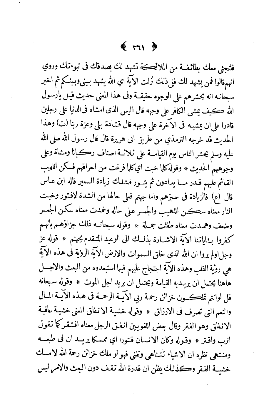 فلتجىء معك بطائفة من الملائكة تشهد لك بصدقك في نبوءتك وروي أنهم قالوا فمن يشهد لك ففي ذلك نزلت الآية أي الله يشهد بيني وبينكم ثم أخبر سبحانه أنه يحشرهم على الوجوه حقيقة وفي هذا المعنى حديث قيل يا رسول الله كيف يمشى الكافر على وجهه قال أليس الذي أمشاه في الدنيا على رجلين قادرا على أن يمشيه في الآخرة على وجهه قال قتادة بلى وعزة ربنا ت وهذا الحديث قد خرجه الترمذي من طريق أبي هريرة قال قال رسول الله صلى الله عليه و سلم يحشر الناس يوم القيامة على ثلاثة أصناف ركبانا ومشاة وعلى وجوههم الحديث