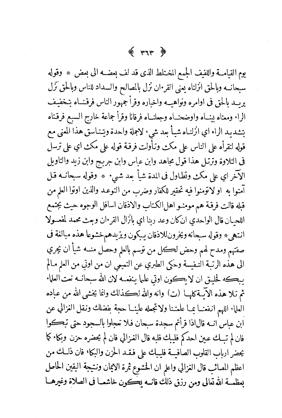 وقوله سبحانه ويخرون للأذقان يبكون ويزيدهم خشوعا هذه مبالغة في صفتهم ومدح لهم وحض لكل من توسم بالعلم وحصل منه شيئا إن يجري إلى هذه الرتبة النفسية وحكى الطبري عن التميمي أن من اوتي من العلم مالم يبكه لخليق ان لا يكون أوتي علما ينفعه لأن الله سبحانه نعت العلماء ثم تلا هذه الآية كلها ت وأنه والله لذلك وإنما يخشى الله من عباده العلماء اللهم انفعنا بما علمتنا ولا تجعله علينا حجة بفضلك ونقل الغزالي عن ابن عباس أنه قال إذا قرأتم سجدة سبحان فلا تعجلوا بالسجود حتى تبكوا فإن لم تبك عين أحدكم فليبك قلبه قال الغزالي فإن لم يحضره حزن وبكاء كما يحضر أرباب القلوب الصافية فليبك على فقد الحزن والبكاء فإن ذلك من أعظم المصائب قال الغزالي وأعلم أن الخشوع ثمرة الإيمان ونتيجة اليقين الحاصل بعظمة الله تعالى ومن رزق ذلك فإنه يكون خاشعا في الصلاة وغيرها