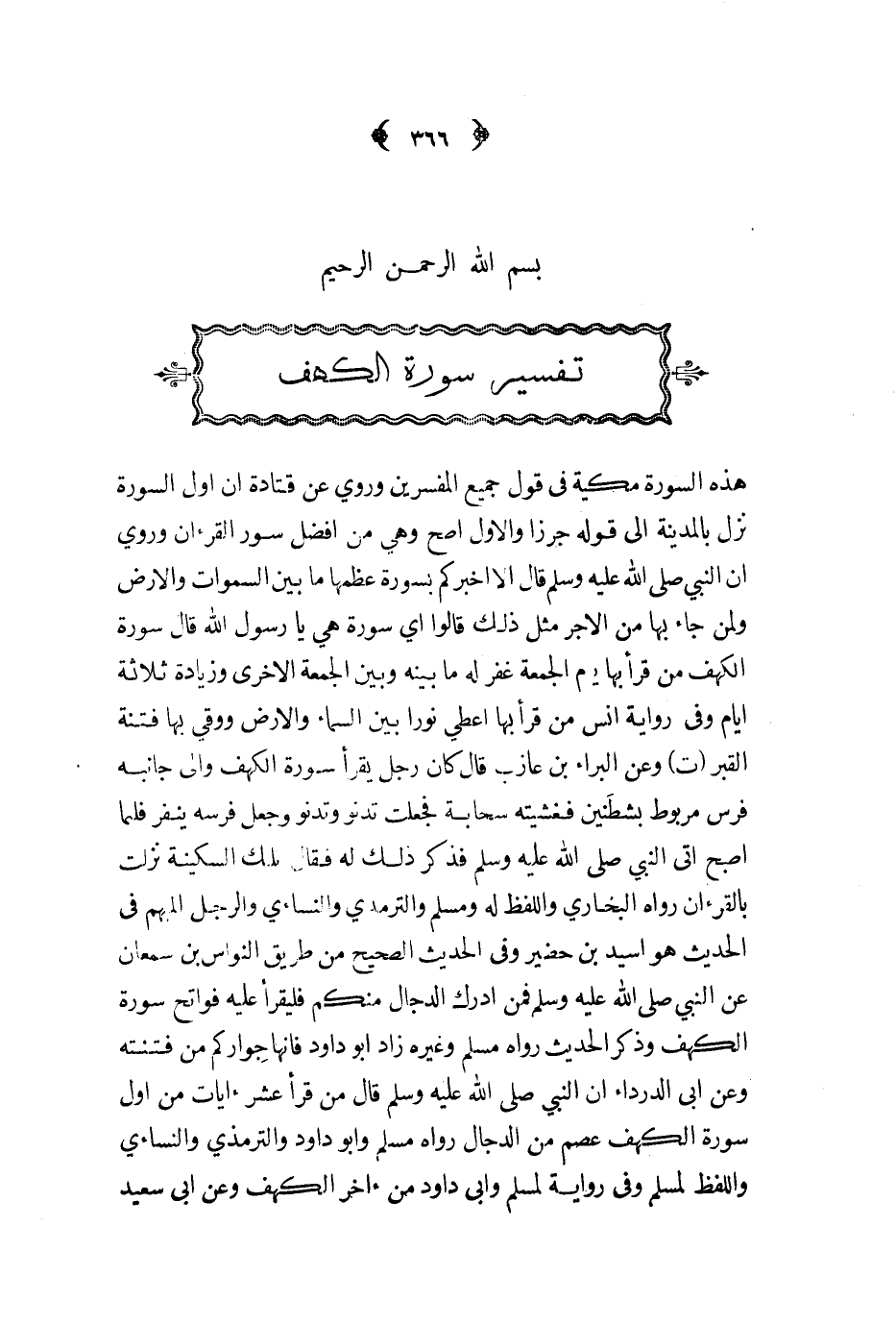 هذه السورة مكية في قول جميع المفسرين وروي عن قتادة أن أول سورة نزل بالمدينة إلى قوله جرزا والأول أصح وهي من أفضل سور القرآن وروي أن النبي صلى الله عليه و سلم قال ألا أخبركم بسورة عظمها ما بين السماوات والأرض ولمن جاء بها من الأجر مثل ذلك قالوا أي سورة هي يا رسول الله قال سورة الكهف من قرأ بها يوم الجمعة غفر له ما بينه وبين الجمعة الأخرى وزيادة ثلاثة أيام وفي رواية أنس من قرأ بها أعطي نور بين السماء والأرض وووقي بها فتنة القبر وعن البراء بن عازب قال كان رجل يقرا سورة الكهف وإلى جانبه فرس مربوط بشطنين فغشيته سحابه فجعلت تدنو وتدنو وجعل فسرسه ينفر فلما أصبح أتى النبي صلى الله عليه و سلم فذكر ذلك له فقال تلك السكينة نزلت بالقرآن رواه البخاري واللفظ له ومسلم والترمذي والنسائي والرجل المبهم في الحديث هو أسيد بن حضير وفي الحديث الصحيح من طريق النواس بن سمعان عن النبي صلى الله عليه و سلم فمن أدرك الدجال منكم فليقرأ عليه فواتح سورة الكهف وذكر الحديث رواه مسلم وغيره زاد أبو داود فإنها جواركم من فتنته وعن أبي الدرداء أن النبي صلى الله عليه و سلم قال من قرأ عشرة آيات من أول سورة الكهف عصم من الدجال رواه مسلم وأبو داود والترمذي والنسائي واللفظ لمسلم وفي رواية لمسلم وأبي داود من آخر الكهف وعن أبي سعيد