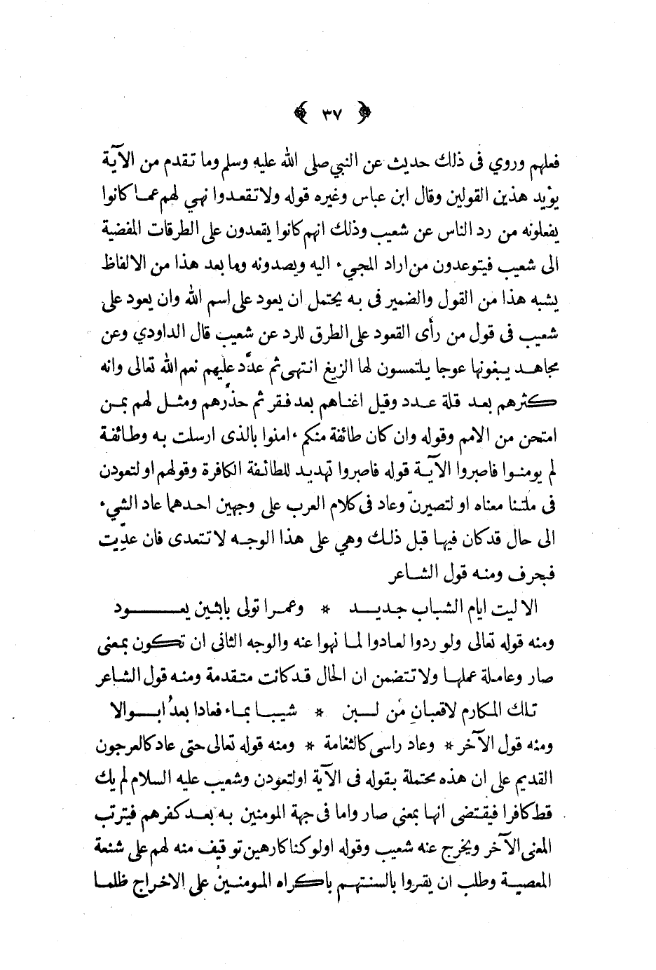 فعلهم وروي في ذلك حديث عن النبي صلى الله عليه و سلم وما تقدم من الآية يؤيد هذين القولين وقال ابن عباس وغيره قوله ولا تقعدوا نهى لهم عما كانوا يفعلونه من رد الناس عن شعيب وذلك أنهم كانوا يقعدون على الطرقات المفضية إلى شعيب فيتوعدون من أراد المجيء إليه ويصدونه وما بعد هذا من الألفاظ يشبه هذا من القول والضمير في به يحتمل أن يعود على اسم الله وأن يعود على شعيب في قوله من رأى القعود على الطرق للرد عن شعيب قال الداودي وعن مجاهد يبغونها عوجا يلتمسون لها الزيغ انتهى ثم عدد عليهم نعم الله تعالى وأنه كثرهم بعد قلة عدد وقيل أغناهم بعد فقرهمثم حذرهم ومثل لهم بمن امتحن من الأمم وقوله وان كان طائفة منكم آمنوا بالذي أرسلت به وطائفة لم يؤمنوا فاصبروا الآية قوله اصبروا تهديد للطائفة الكافرة وقولهم أو لتعودن في ملتنا معناه أو لتصيرن وعاد في كلام العرب على وجهين أحدهما عاد الشيء إلى حال قد كان فيها قبل ذلك وهي على هذا الوجه لا تتعدى فإن عديت فبحرف ومنه قول الشاعر ... ألا ليت أيام الشباب جديد ... وعمرا تولى بابثين يعود ...