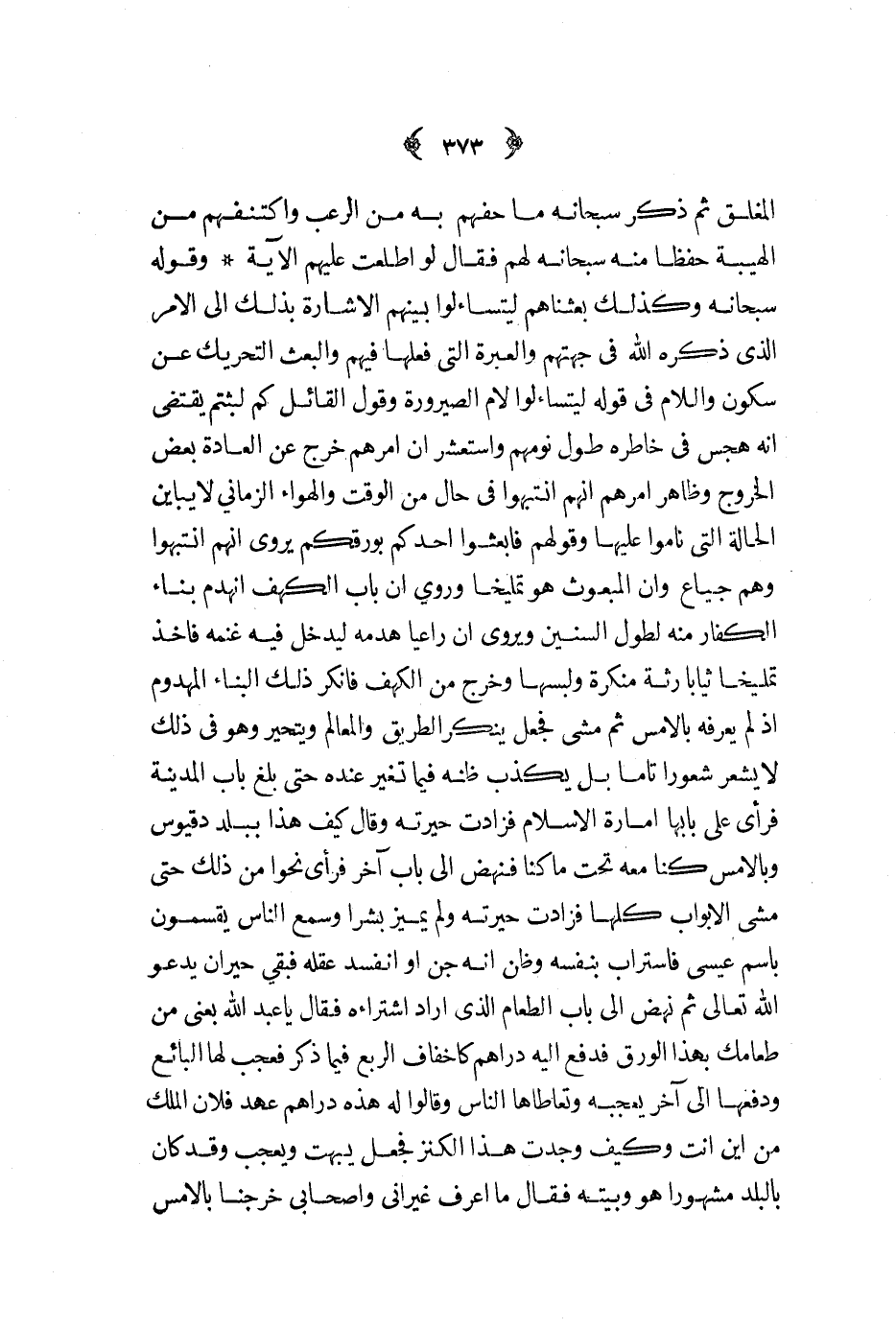 وقوله سبحانه وكذلك بعثناهم ليتساءلوا بينهم الإشارة بذلك إلى الأمر الذي ذكره الله في جهتهم والعبرة التي فعلها فيهم والبعث التحريك عن سكون واللام في قوله ليتساؤلوا لام الصيرورة وقول القائل كم لبتثم يقتضى أنه هجس في خاطره طول نومهم واستعشر أن أمرهم خرج عن العادة بضع الخروج وظاهر أمرهم أنهم انتبهوا في حال من الوقت والهواء الزماني لا يباين الحالة التي ناموا عليها وقوله فابعثوا أحدكم بورقكم يروي أنهم انتبهوا وهم جياع وأن المبعوث هو تمليخا وروي أن باب الكهف انهدم بناء الكفار منه لطول السنين ويروى أن راعيا هدمه ليدخل فيه غنمه فأخذ تمليخا ثيابا رثة منكرة ولبسها وخرج من الكهف فانكر ذلك البناء المهدوم إذ لم يعرفه بالأمس ثم مشى فجعل ينكر الطريق والمعالم ويتحير وهو في ذلك لا يشعر شعورا تاما بل يكذب ظنه فيما تيغر عنده حتى بلغ باب المدينة فرأى على بابها إمارة الأسلام فزادت حيرته وقال كيف هذا ببلد دقيوس وبالأمس كنا معه تحت ما كنا فنهض إلى باب آخر فرأى نحوا من ذلك حتى مشى الأبواب كلها فزادت حيرته ولم يميز بشرا وسمع الناس يقسمون باسم عيسى فاستراب بنفسه وظن أنه جن أو انفسد عقله فبقي حيران يدعو الله تعالى ثم نهض إلى باب الطعام الذي أراد اشتراءه فقال يا عبد الله بعني من طعامك بهذا الورق فدفع إليه دراهم كاخفاف الربع فيما ذكر فعجب لها البائع ودفعها إلىآخر يعجبه وتعاطاها الناس وقالوا له هذه دراهم عهد فلان الملك من أين أنت وكيف وجدت هذا الكنز فجعل يبهت ويعجب وقد كان بالبلد مشهورا هو وبيته فقال ما أعرف غير أني وأصحابي خرجنا بالأمس