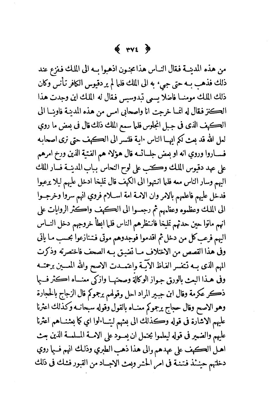 من هذه المدينة فقال الناس هذا مجنون أذهبوا به إلى الملك ففزع عند ذلك فذهب به حتى جيء به إلى الملك فلما لم ير دقيوس الكافر تأنس وكان ذلك الملك مؤمنا فاضلا يسمى تبدوسيس فقال له الملك أين وجدت هذا الكنز فقال له إنما خرجت أنا وأصحابي أمس من هذه المدينة فأوينا إلى الكهف الذي في جبل أنجلوس فلما سمع الملك ذلك قال في بعض ما روي لعل الله قد بعث لكم أيها النسا آية فلنسر إلى الكهف حتى نرى أصحابه فساروا وروي أنه أو بعض جلسائه قال هؤلاء هم الفتية الذين ورخ أمرهم على عهد دقيوس الملك وكتب على لوح النحاس بباب المدينة فسار الملك إليهم وسار الناس معه فلما انتهوا إلى الكهف قال تمليخا أدخل عليهم ليلا يرعبوا فدخل عليهم فأعلمهم بالأمر وأن الأمة أمة إسلام فروي أنهم سروا وخرجوا إلى الملك وعظموه وعظمهم ثم رجعوا إلى الكهف وأكثر الروايات على أنهم ماتوا حين حدثهم تمليخا فانتظرهم الناس فلما ابطأ خروجهم دخل الناس إليهم فرعب كل من دخل ثم اقدموا فوجدوهم موتى فتنازعوا بحسب ما يأتي وفي هذا القصص من الاختلاف ما تضيق به الصحف فاختصرته وذكرت المهم الذي به تتفسر ألفاظ الآية واعتمدت الأصح والله المعين برحمته وفي هذا البعث بالورق جواز الوكالة وصحتها وأزكى معناه أكثر فيما ذكر عكرمة وقال ابن جبير المراد أحل وقولهم يرجموكم قال الزجاج بالحجارة وهو الأصح وقال حجاج يرجموكم معناه بالقول وقوله سبحانه وكذلك اعثرنا عليهم الإشارة في قوله وكذلك إلى بعثهم ليتساءلوا أي كما بعثناهم اعثرنا عليهم والضمير في قوله ليعلموا يحتمل أن يعود على الأمة المسلمة الذين بعث أهل الكهف على عهدهم وإلى هذا ذهب الطبري وذلك أنهم فيما روي دخلتهم حينئذ فتنة في أمر الحشر وبعث الأجساد من القبور فشك في ذلك